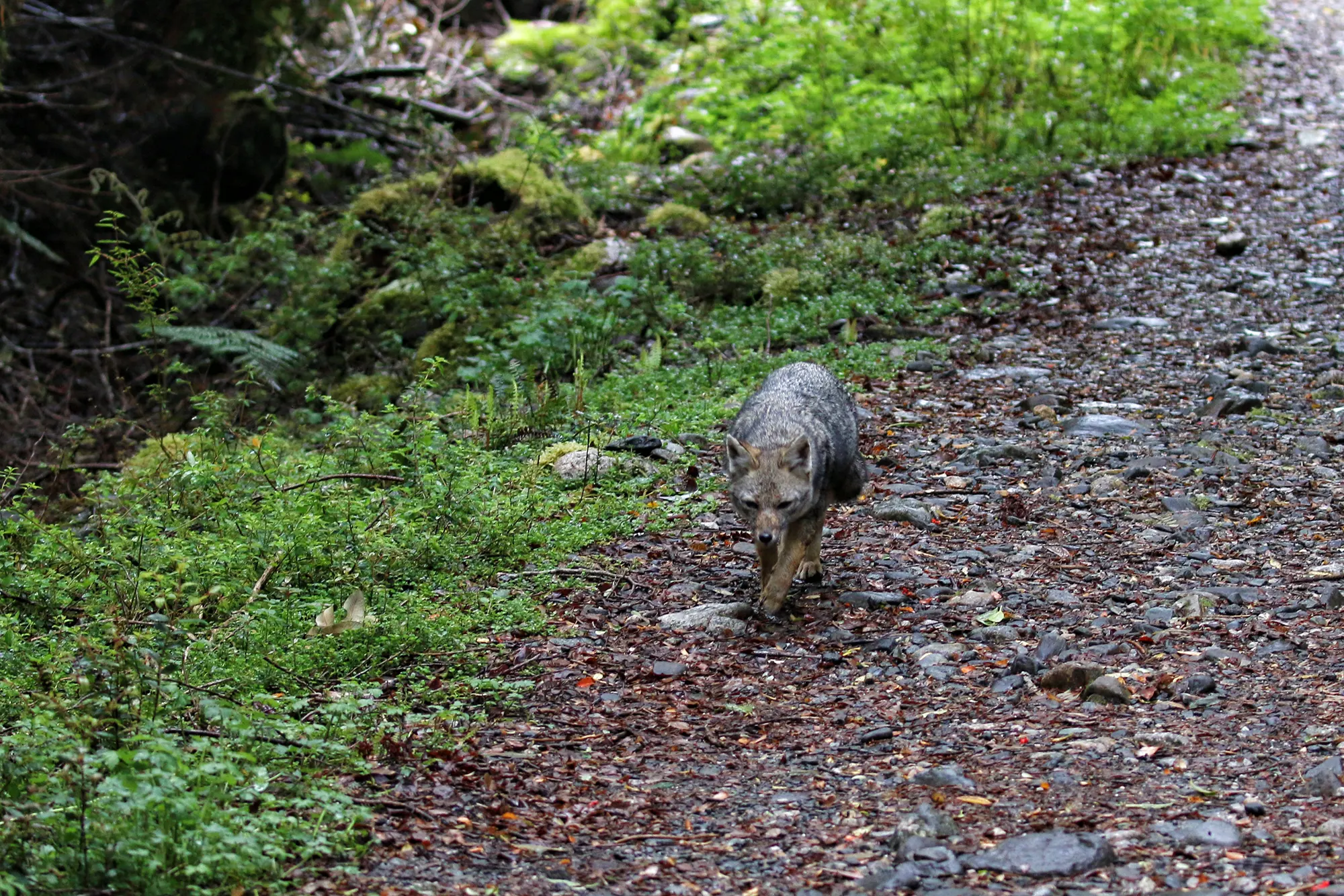 Stiekem hopen we altijd op een beetje wildlife. In de bossen levn een aantal bijzondere dieren. Natuurlijk heb je altijd een beetje geluk nodig om deze dieren te zien. Dat geluk hebben we tot op heden nog niet gehad, mede door de regen. We hebben wel al enkele kleurrijke vogels gezien, maar vooral gehoord. Op de terugweg is het droog en wie weet hebben we nu meer geluk? We horen soort zoemend geluid en al snel zien we waar dat vandaan komt. Bij de rode bloemen in de bomen zien we een kolibrie. Jammer genoeg gaat het allemaal zo snel dat we er geen foto van kunnen maken. Niet veel later zien we een dier over het wandelpad lopen. Eerst denken we dat het een katachtige is, maar het blijkt een vos te zijn. Onverstoord komt het dier op ons afstevenen. De vos lijkt helemaal niet bang te zijn, want het passeert ons alsof we er niet staan. Nadat het ons is gepasseerd, draait hij zich even kort om en kijkt hij ons aan. Daarna tippelt het dier weer vrolijk verder. Toch nog een bijzondere ontmoeting gehad tijdens deze wandeling.