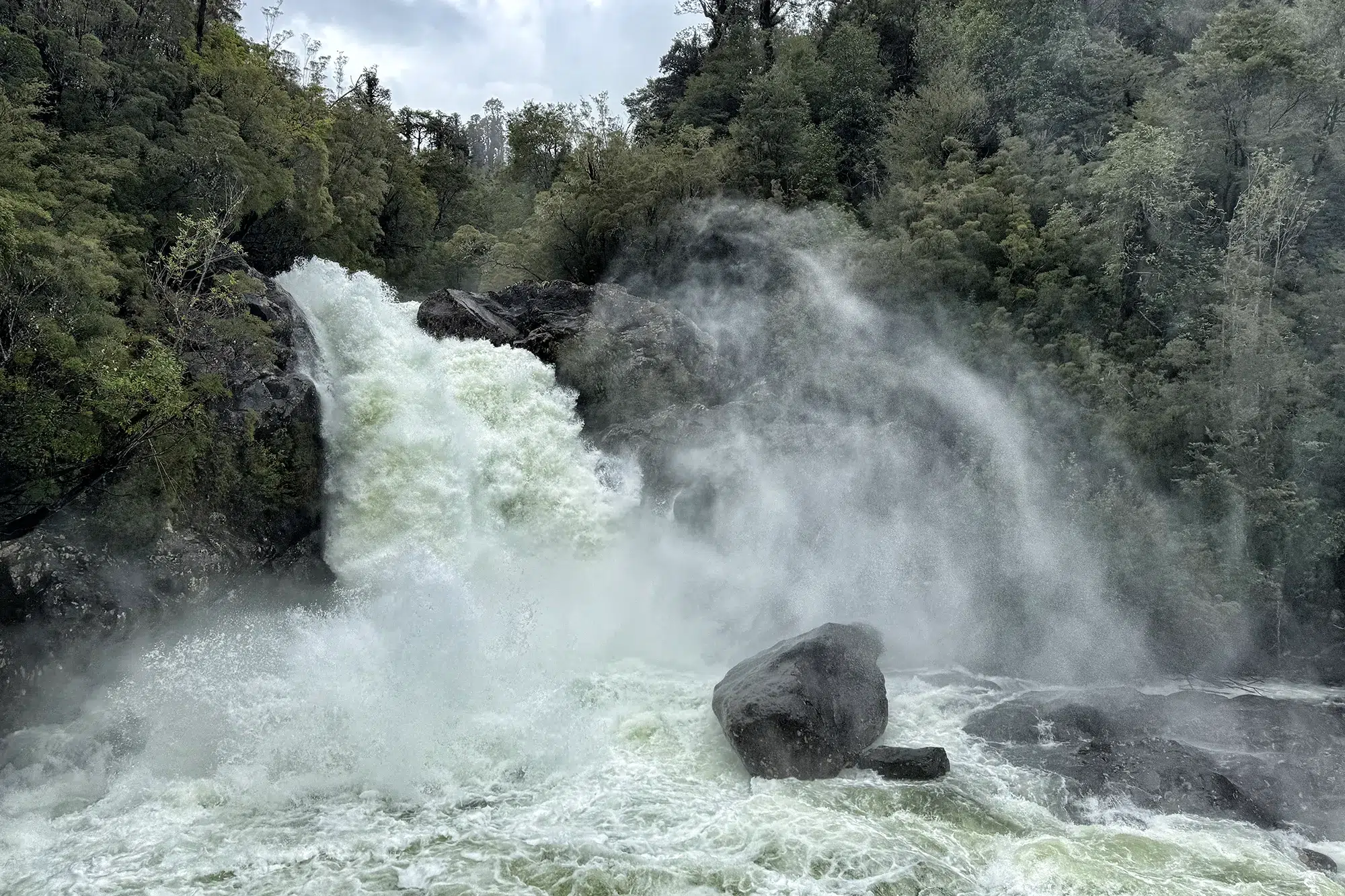 Hoewel het pad af en toe haast op een rivier lijkt, loopt parallel aan de route natuurlijk de echte rivier. De Río Chiacas is bij ons een vrij wilde rivier geworden vanwege de regenval. Op sommige stukken hebben we een inkijkje op het water. Af en toe duiken we ook even de struiken in voor een mooie foto. Na ongeveer 4,5 kilometer bereiken we een klein trappetje omhoog. Hier horen we al een flink geruis. Eenmaal boven bereiken we het uitkijkplatform met zicht op de waterval Saltos Río Chaicas. Vooraf had ik beelden gezien van deze waterval op YouTube. Daar zag de waterval er vrij lieflijk uit, bij ons stort het water van alle kanten naar beneden. Met alle waternevel is het nauwelijks mogelijk om een goede foto te maken, maar het ziet er op deze manier wel spectaculair uit. Als je overigens nog iets verder wandelt, heb je aan de linkerzijde nog een tweede kleinere waterval.