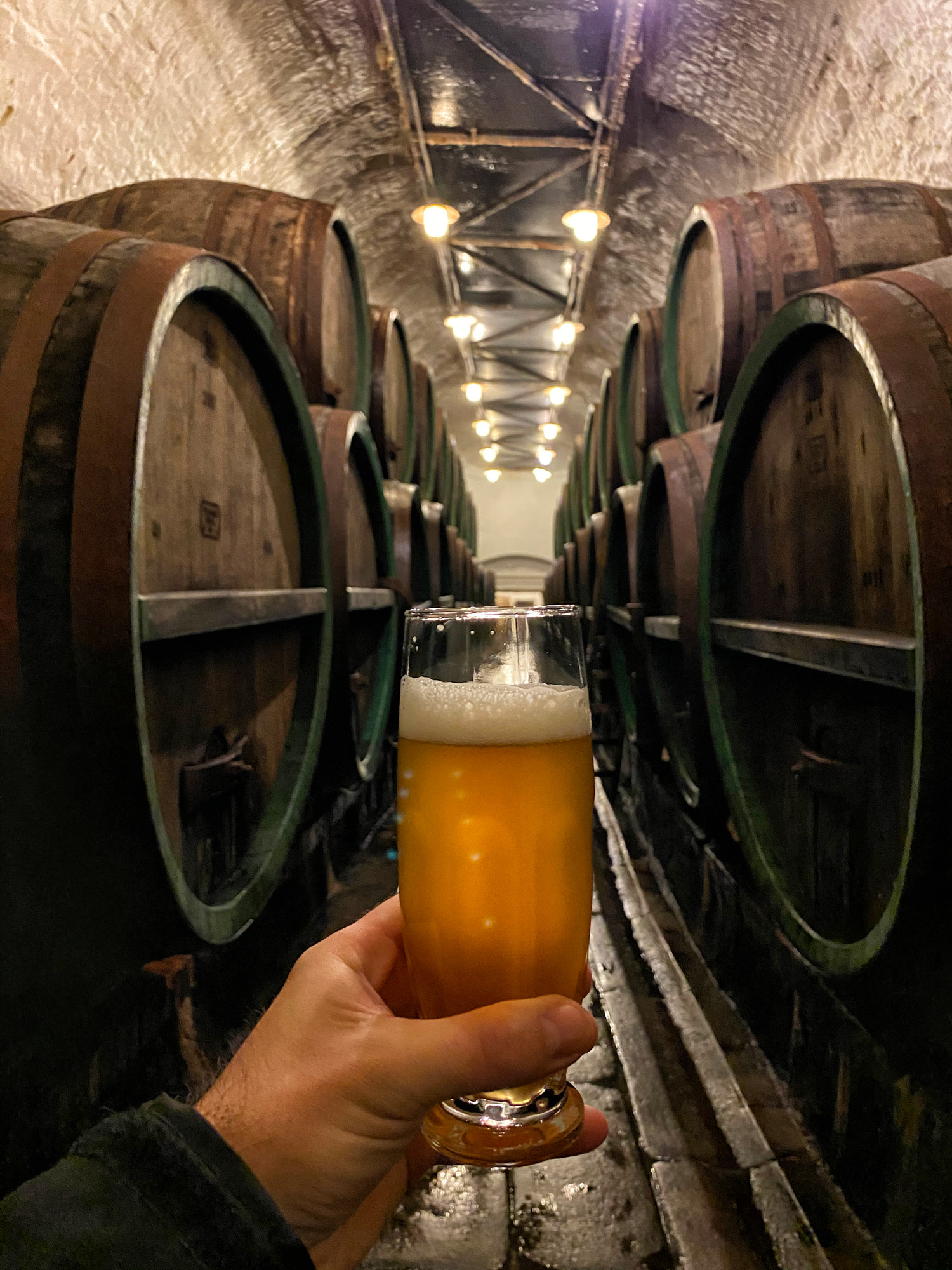 In het gangenstelsel onder de brouwerij mag ik een ongefilterd pilsje proeven, rechtstreeks getapt van de lagertanks.