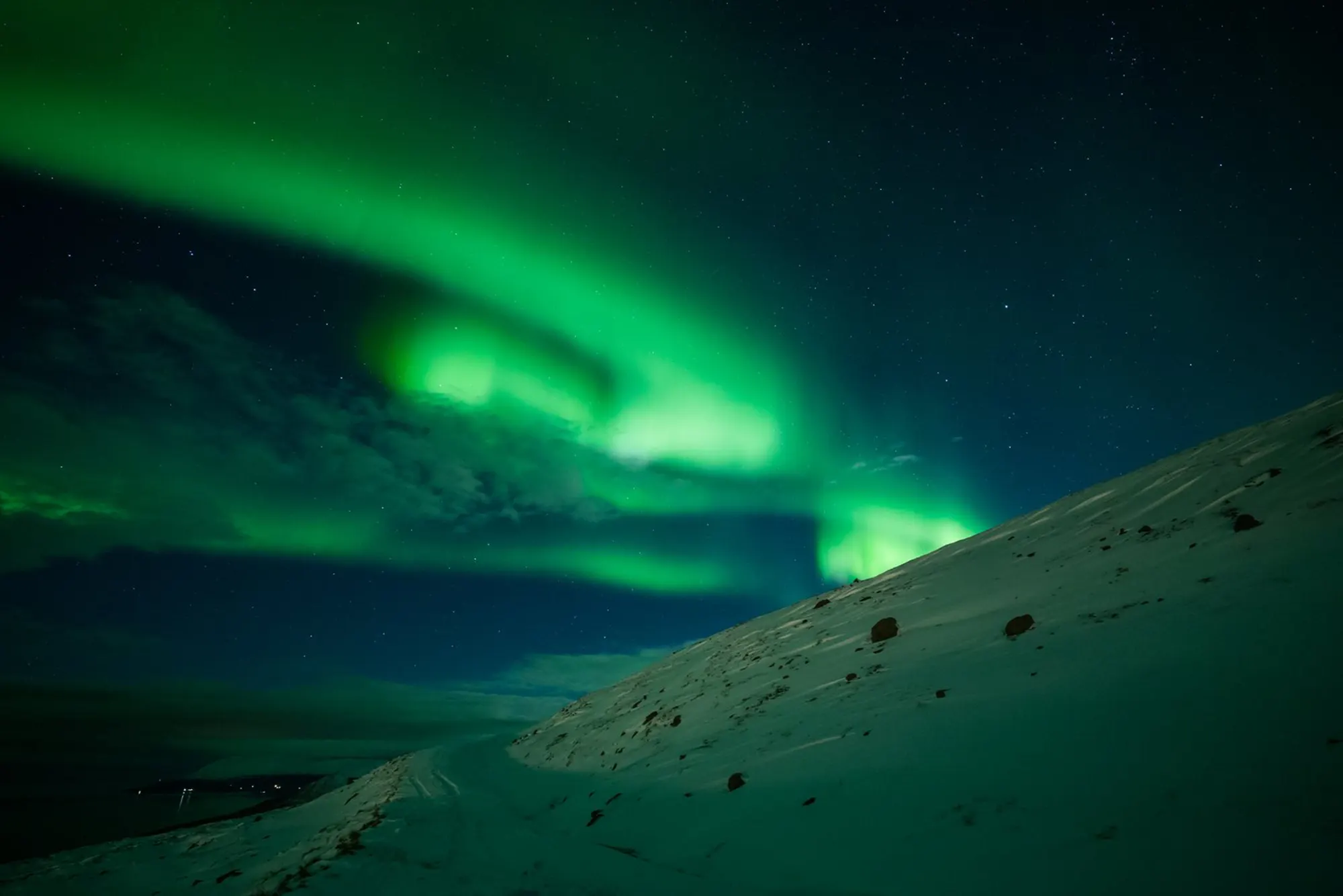 Het noorderlicht verschijnt als bewegende sluiers van groen en soms paars licht die langzaam door de lucht trekken. De ene keer is het een zwakke gloed aan de horizon, de andere keer vult het licht bijna de hele hemel. Hoe vaak je het ook ziet, het blijft indrukwekkend en is voor veel mensen een van de hoogtepunten van hun reis.