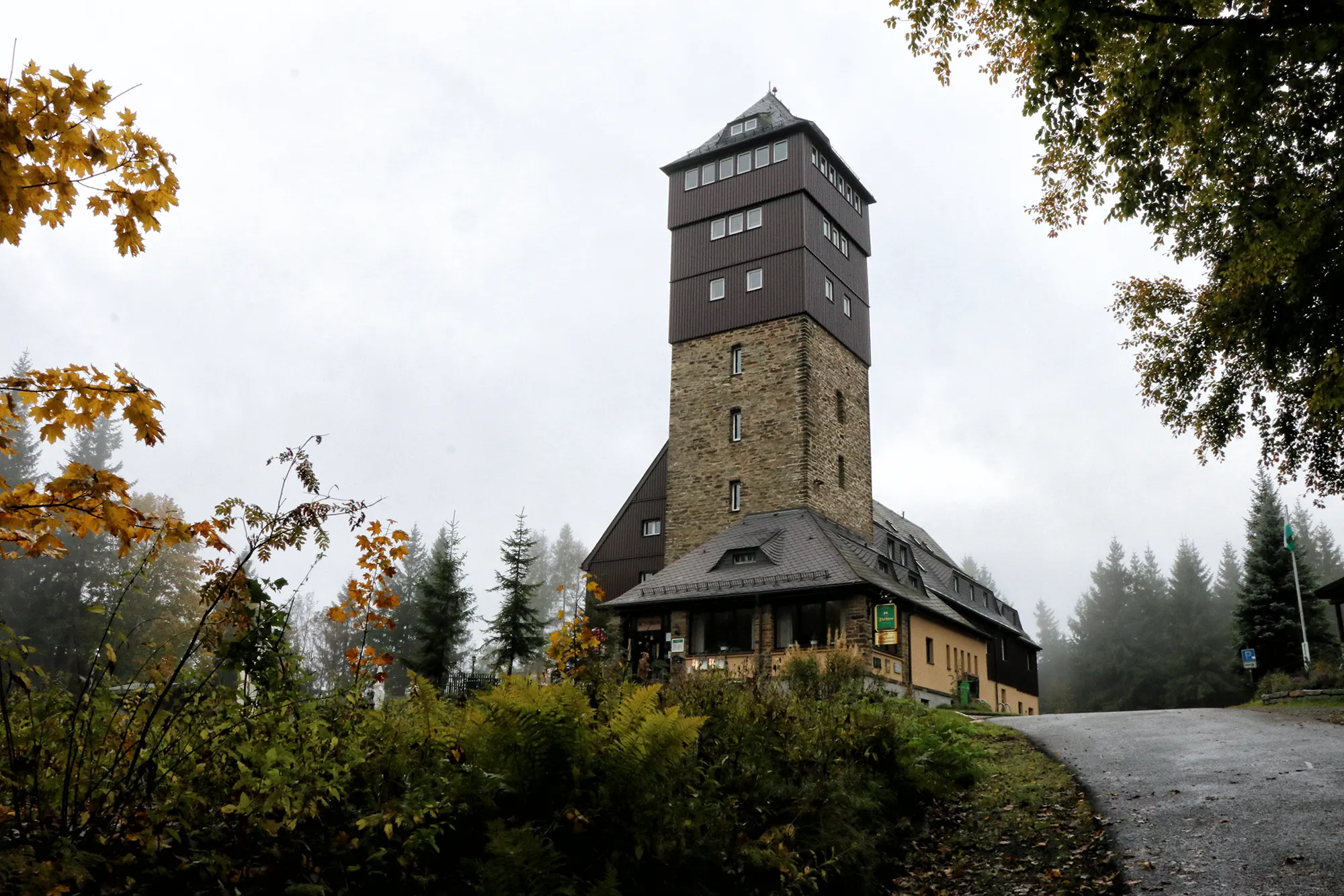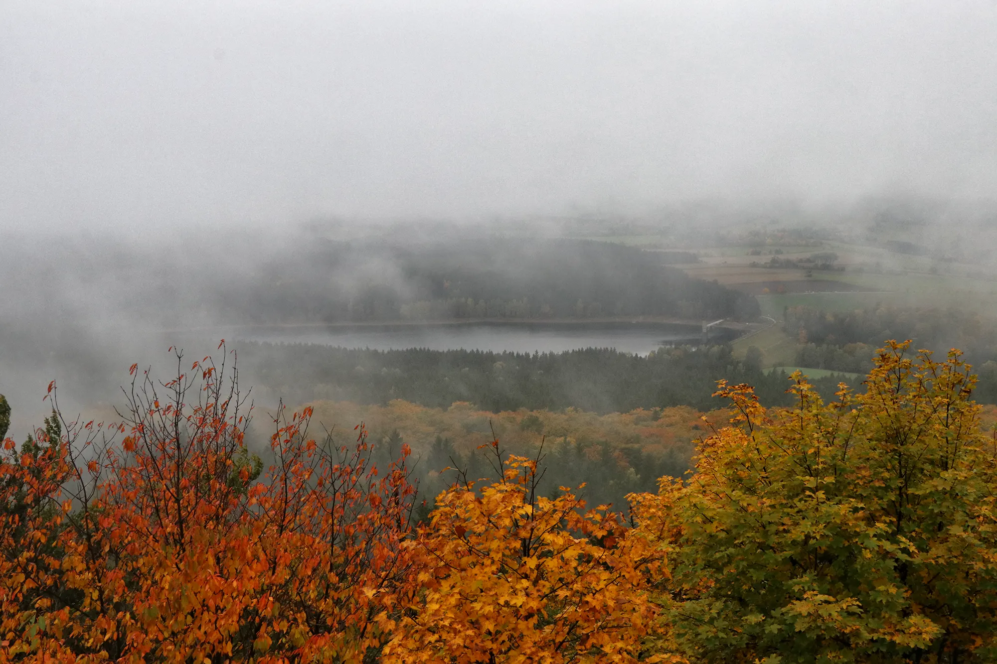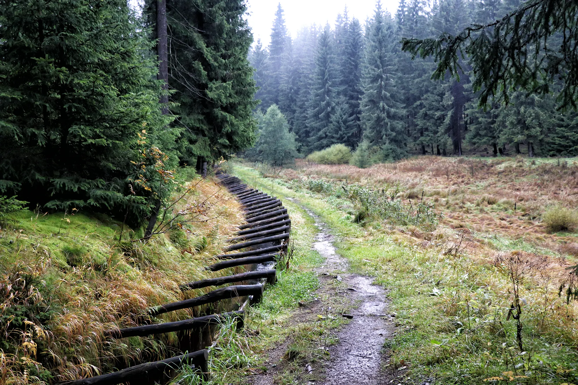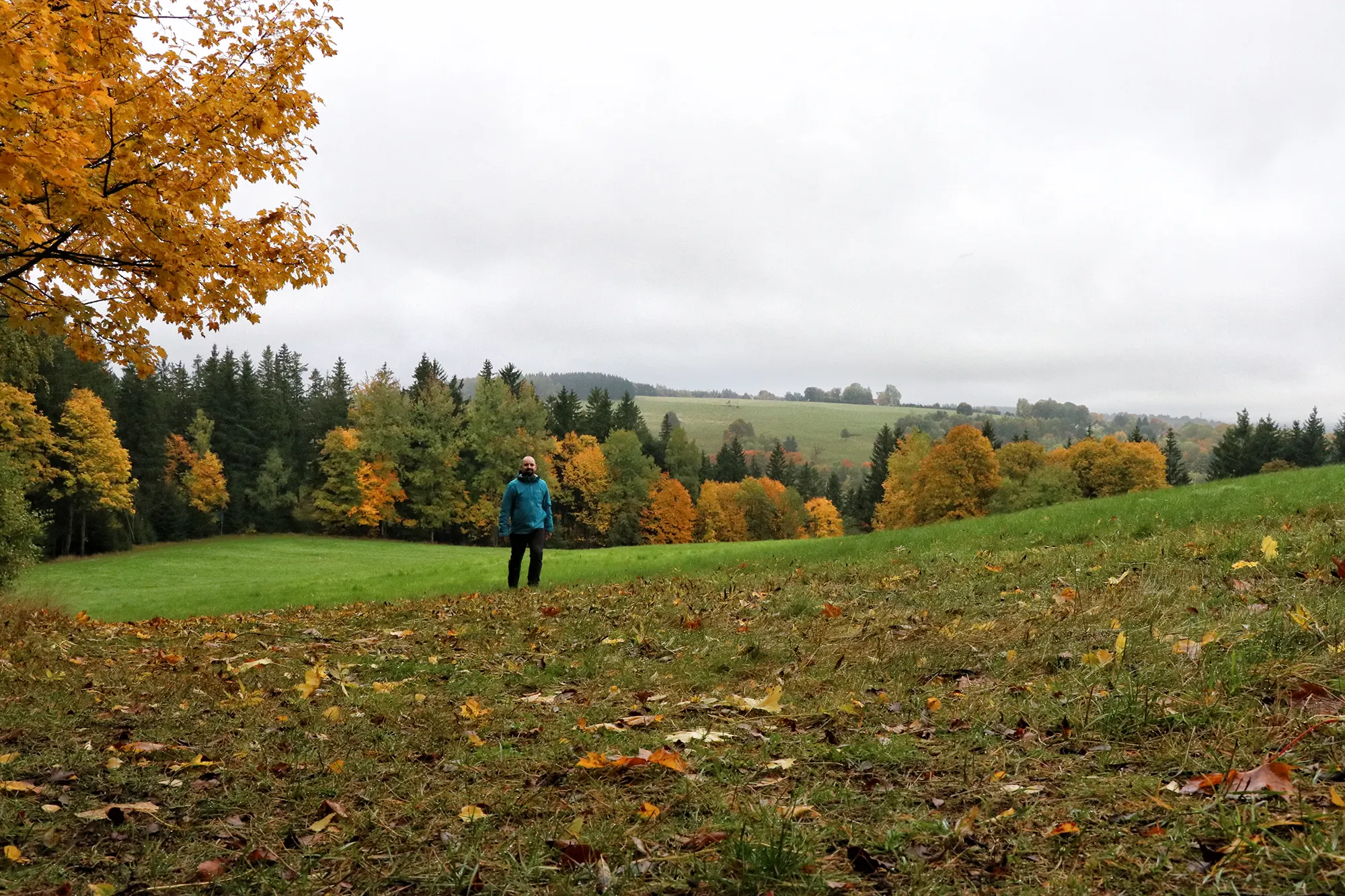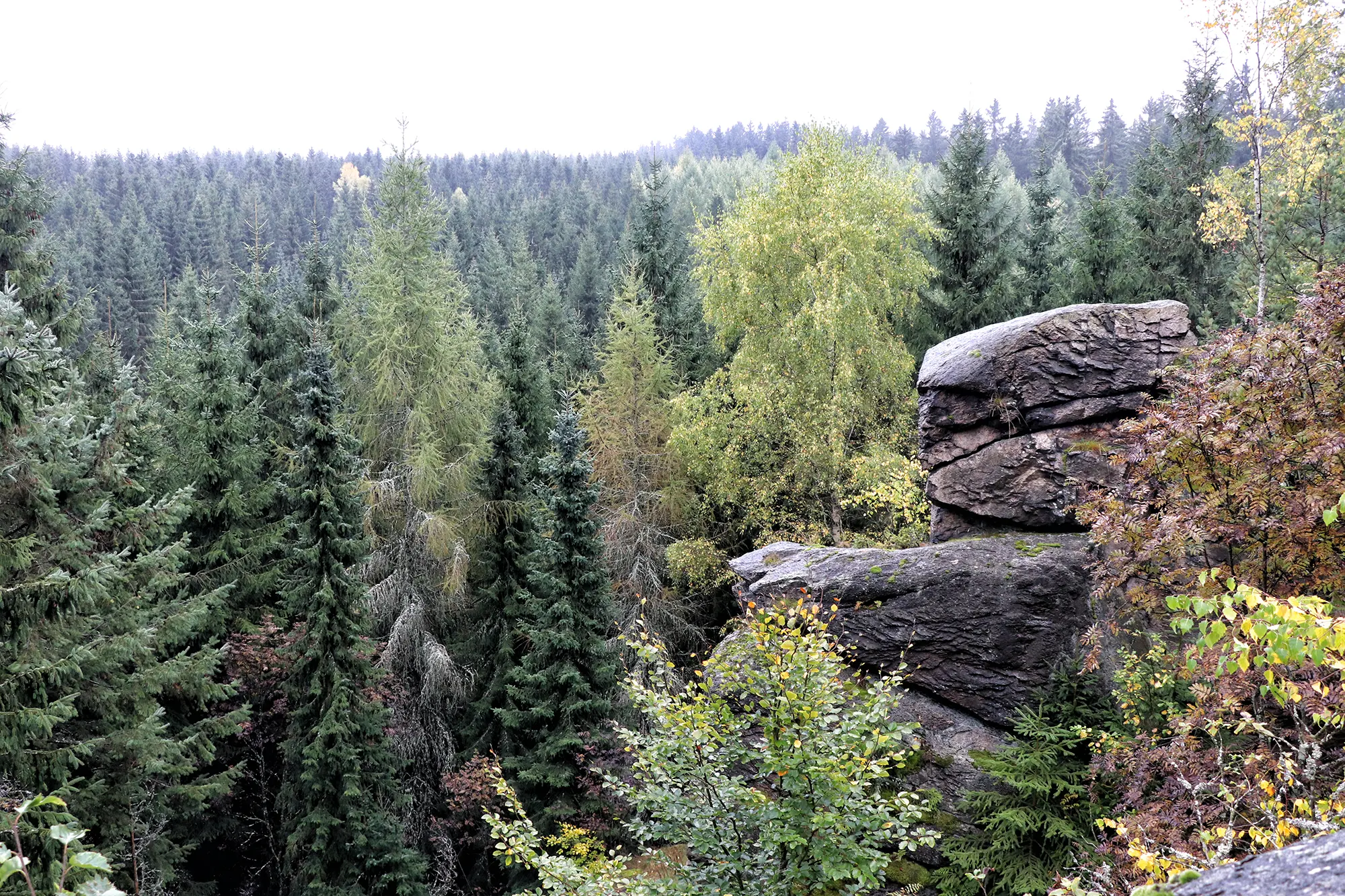 Ik ben al regelmatig in het Ertsgebergte geweest, maar wilde de regio ditmaal op een andere manier ontdekken. De Kammweg leek mij een mooie manier om dat te doen. Ik wandelde niet de gehele route, maar heb in vijf dagen een aantal etappes gewandeld. Mijn route begon bij het startpunt in Geising, waar het pad al snel omhoog ging naar de Geisingberg met uitzicht vanaf de Louisenturm. Althans, dat uitzicht had ik graag gezien, want helaas was het behoorlijk mistig. Die mist en miezerregen zou helaas tijdens de vijf dagen dat ik onderweg was niet verdwijnen. Toch hadden deze omstandigheden dat iets bijzonders. De stilte in de bossen en de mist gaven de wandeling een bijna mysterieuze sfeer. Overal groeiden paddenstoelen, wat samen met de warme herfstkleuren voor een mooi contrast zorgde met het grijze weer.