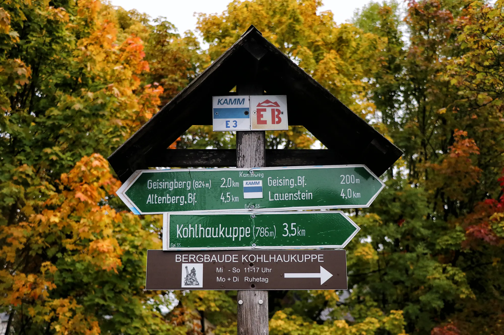 De Kammweg start in Geising (Saksen) en eindigt in Blankenstein (Thüringen), waar ook de Rennsteig en de Frankenweg samenkomen.