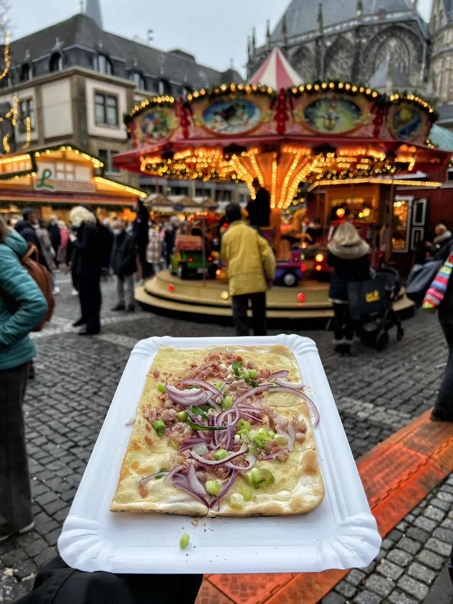 Op culinair gebied heeft de kerstmarkt in Aken natuurlijk de bekende klassiekers: Reibekuchen met appelmoes, knapperige Flammkuchen, geroosterde kastanjes en natuurlijk een broodje Bratwurst. Toch draait het in Aken niet alleen om deze standaardgerechten. Wie goed rondkijkt, ontdekt ook kraampjes met Franse kazen, zachte nougat in verschillende smaken, de beroemde ham uit Montenau of mosterd uit Monschau. Ga dus zeker op ontdekkingstocht en proef verschillende dingen.