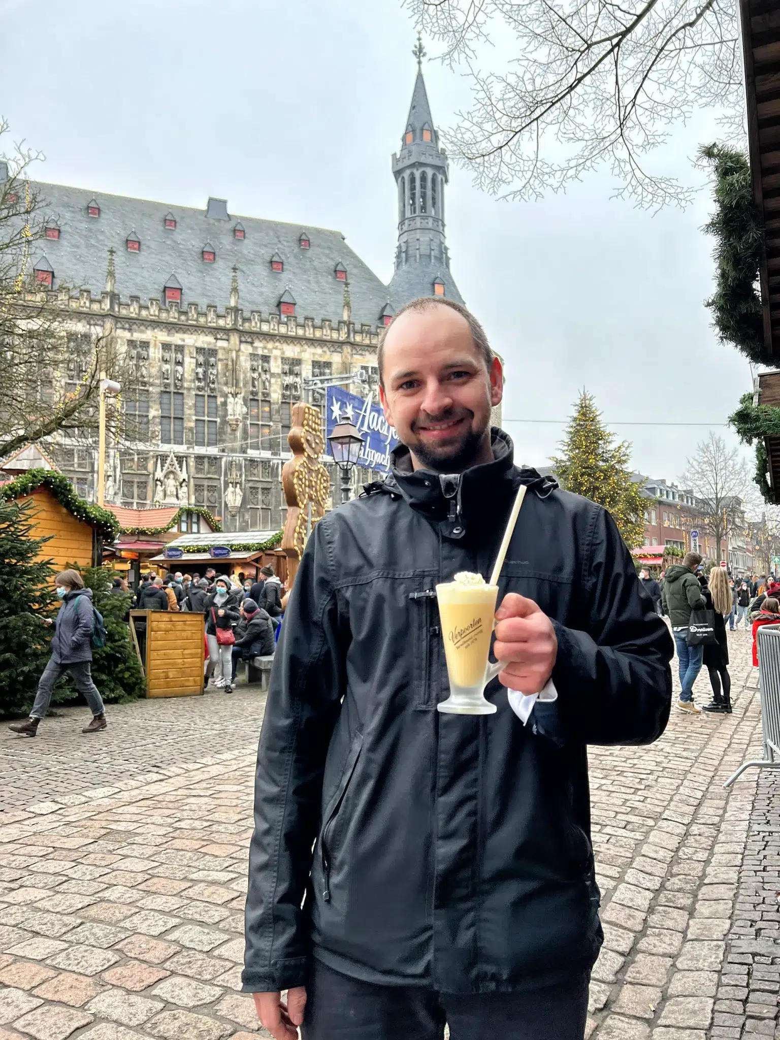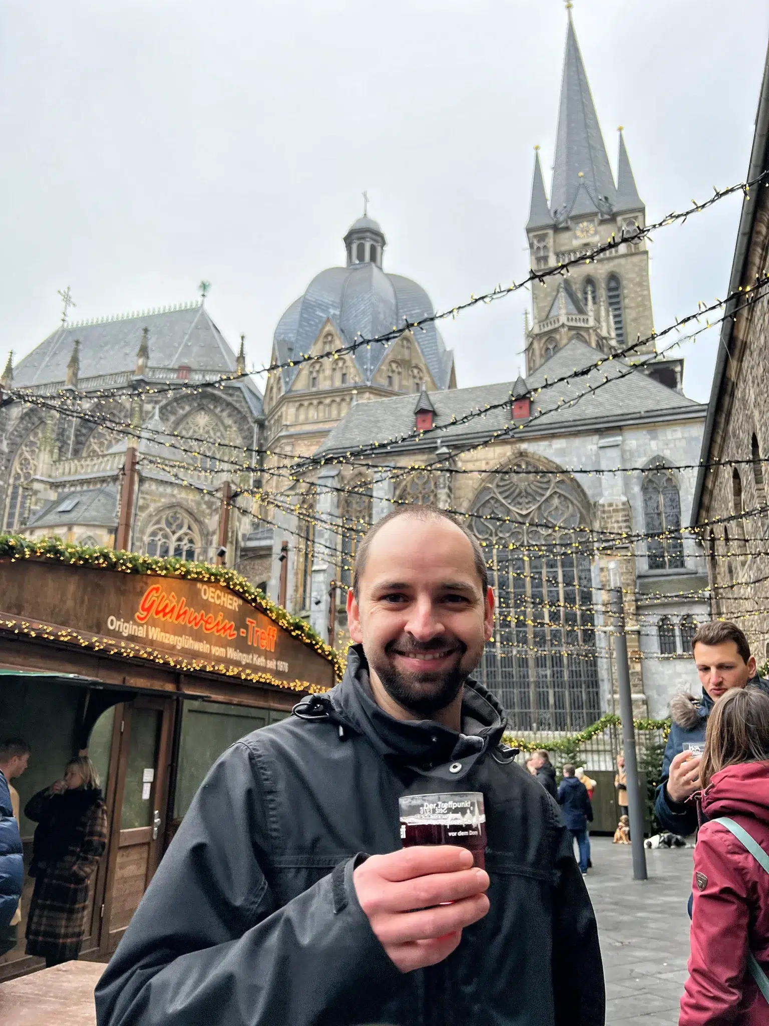 Bij een bezoek aan de kerstmarkt hoort natuurlijk Glühwein. In Aken is er één plek die er wat mij betreft echt bovenuit steekt: de OECHER Glühwein-Treff op het Katschhof. Deze stand bestaat al bijna vijftig jaar en was een van de eerste glühweinkramen in heel Duitsland. Ze hebben hier Winzerglühwein. De wijn komt rechtstreeks van de wijnboer en wordt gemaakt van pure druivenrassen: Dornfelder voor de rode en Müller-Thurgau voor de witte. Dat proef je meteen, want de smaak is voller en minder zoet dan de standaardvarianten. Er is zelfs een rosé glühwein. Voor wie geen alcohol drinkt, zijn er rode en witte alcoholvrije varianten die net zo rijk van smaak zijn. Het geheel wordt geserveerd in de sfeervolle setting tussen de Dom en het stadhuis.