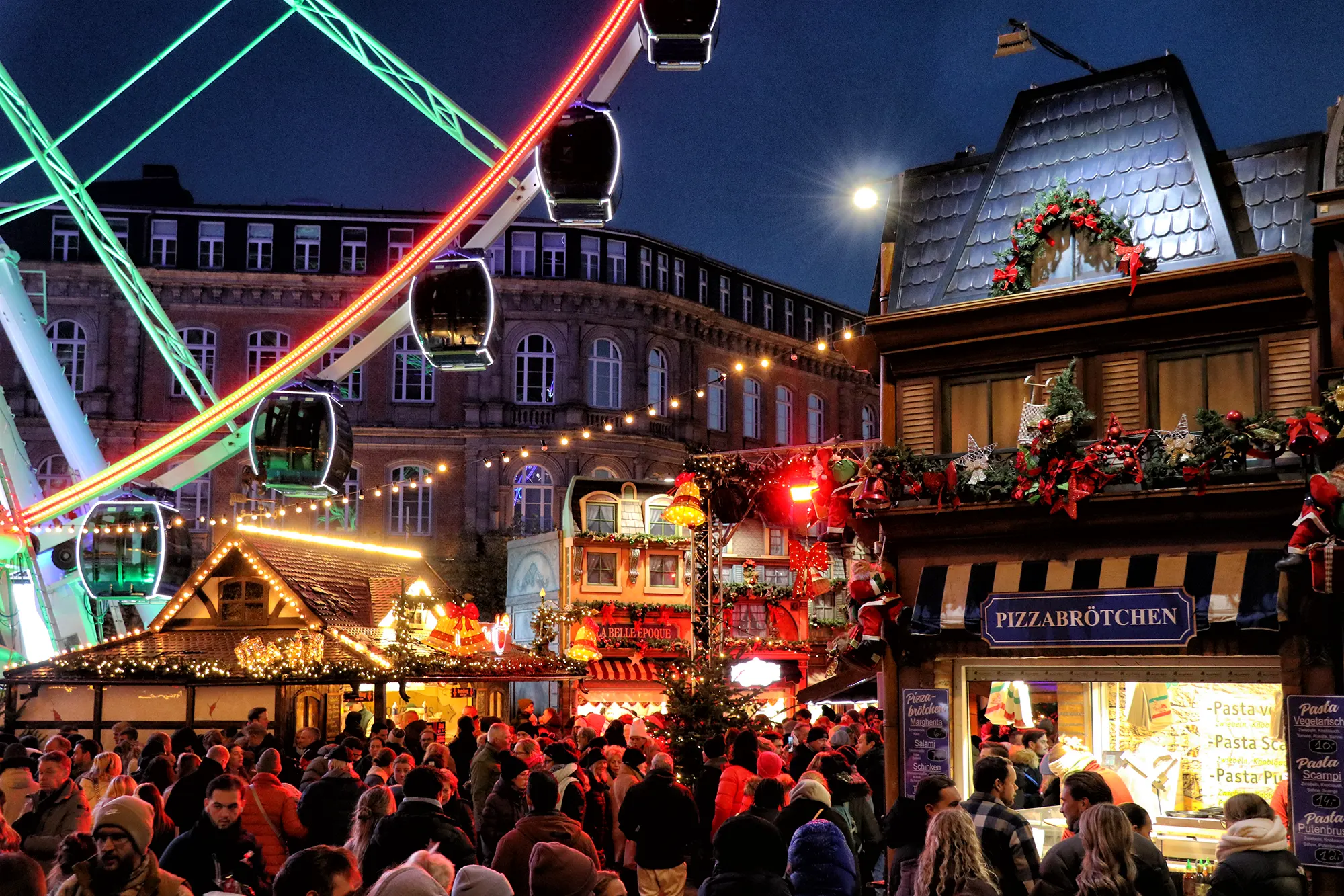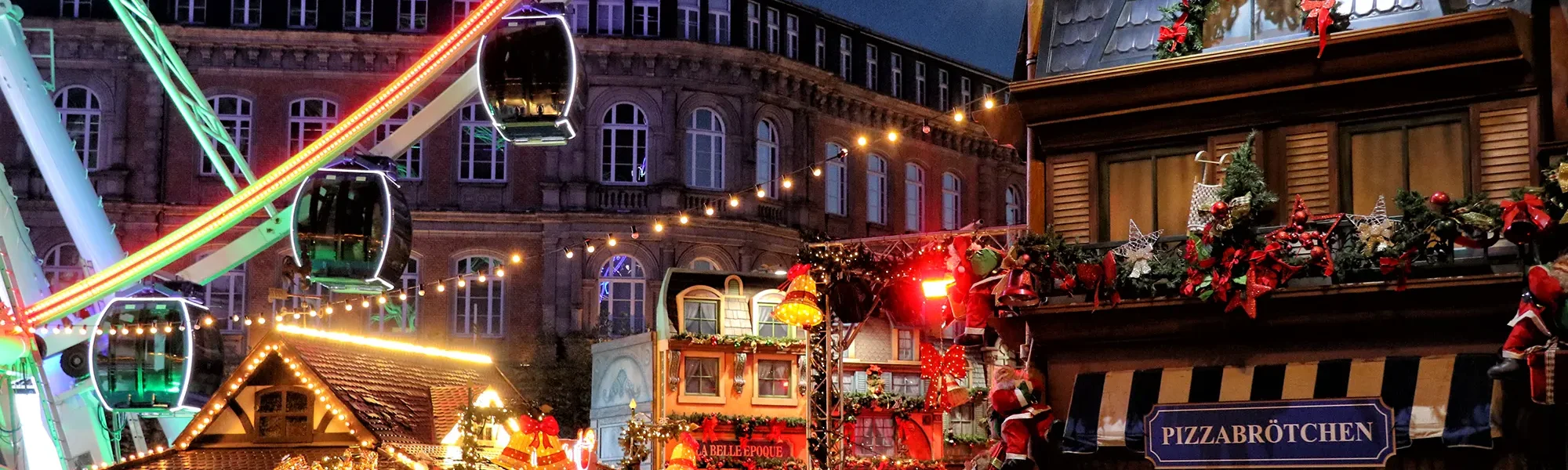 Op de Burgplatz staat ieder jaar het grote reuzenrad, een herkenbaar onderdeel van de kerstperiode in Düsseldorf. Rondom het reuzenrad wordt een klein maar sfeervol kerstmarktplein opgebouwd met prachtig versierde houten hutjes. De kraampjes hebben een warme, bijna Franse uitstraling en doen denken aan de kleine dorpen in de Elzas. Vooral in de avond zorgt het verlichte reuzenrad voor een bijzondere sfeer, wanneer de gondels zacht oplichten en het plein in warm licht staat. Een ritje is zeker aan te raden. Vanuit de gondels kijk je uit over de Altstadt, de Rijnpromenade en de kerstverlichting in de stad.