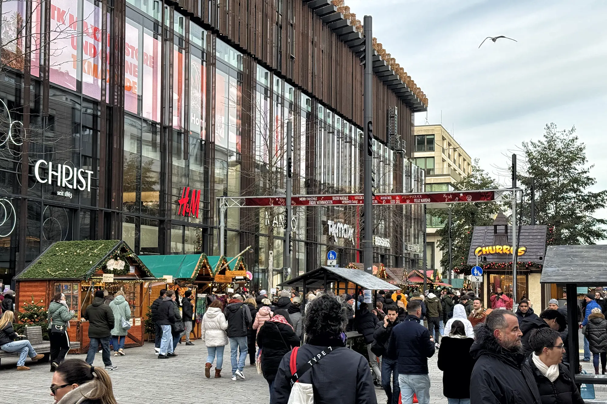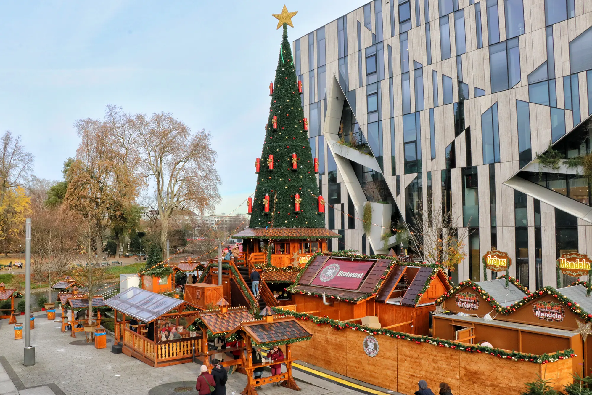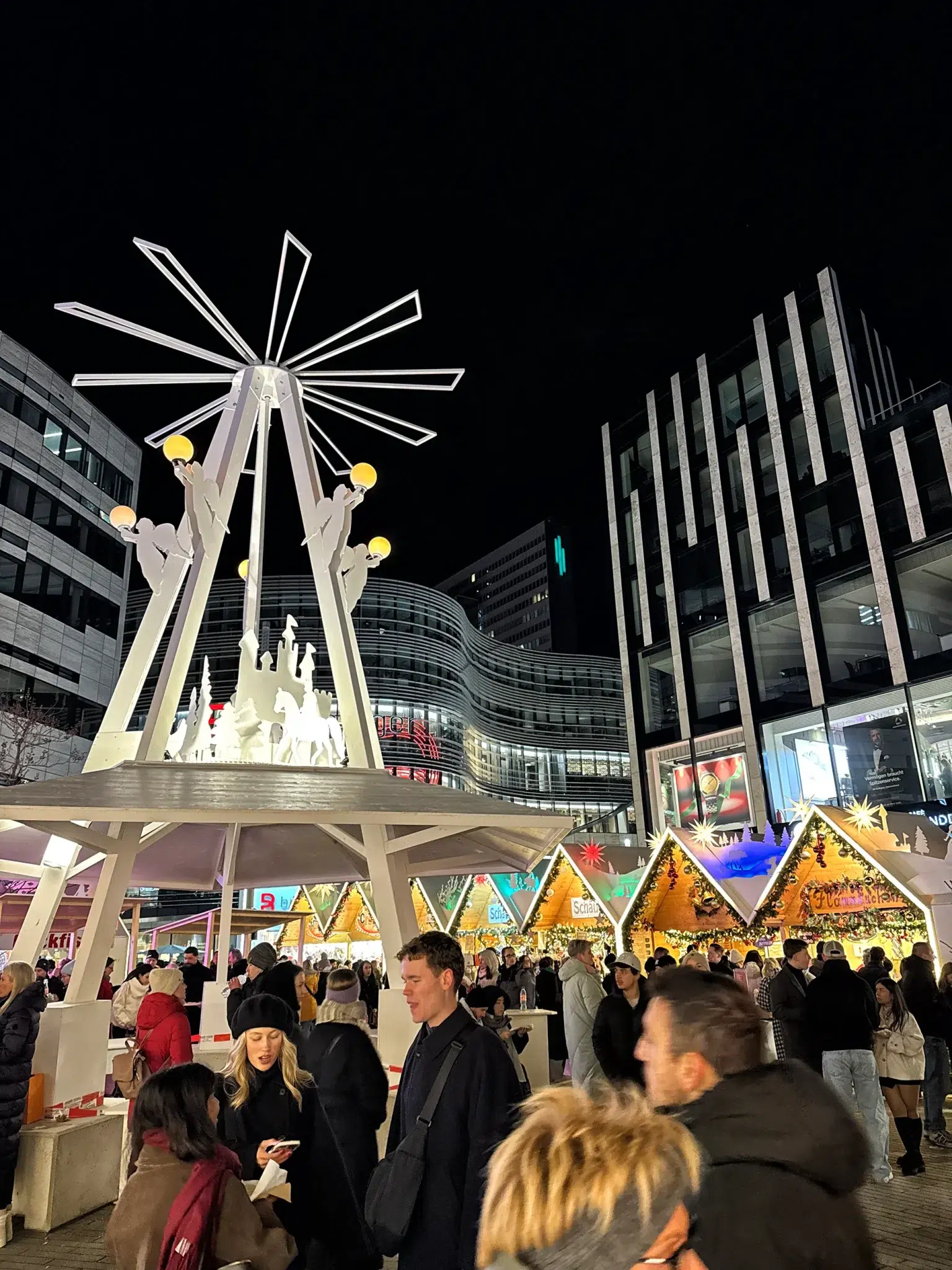 De kerstmarkt breidt zich vaak uit naar de pleinen en straten rondom de Kö-Bogen. Hierdoor ontstaat een aaneengesloten route die je eenvoudig kunt combineren met de andere kerstmarkten in het centrum. Dankzij de ligging bij winkels, cafés en restaurants is dit een fijne plek om even rond te kijken, iets te eten en de sfeer op te nemen.