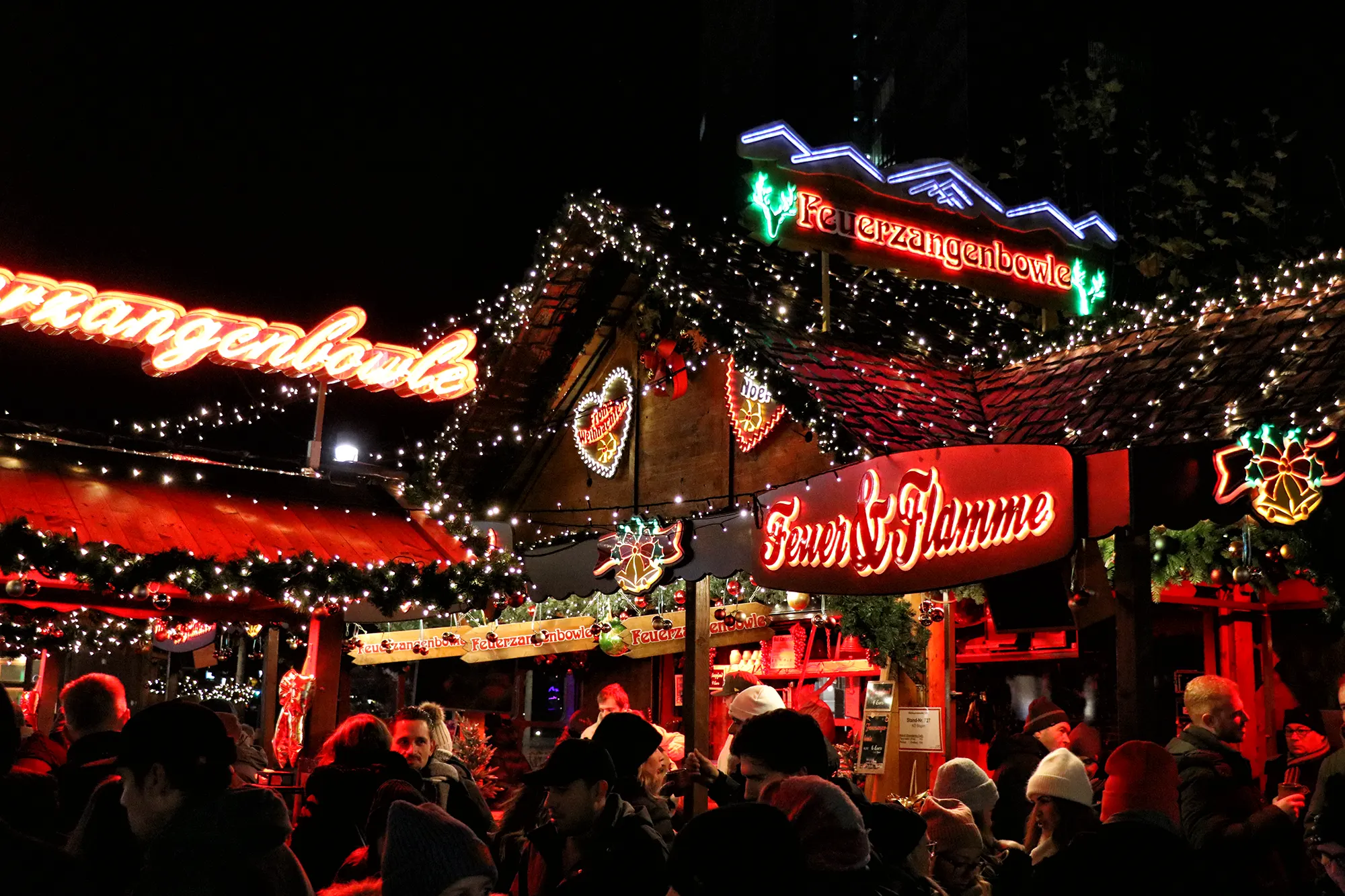 In de Altstadt vind je een van de meest herkenbare kerstmarkten van Düsseldorf. De kraampjes zijn gebouwd in de stijl van oude burgerhuizen, waardoor dit deel van de markt meteen een klassieke uitstraling krijgt. Langs de Flinger Straße staan verschillende hutjes met regionale snacks, warme dranken en kleine cadeaus. De bekende Glühwein-piramide is een opvallend element en trekt altijd veel bezoekers.