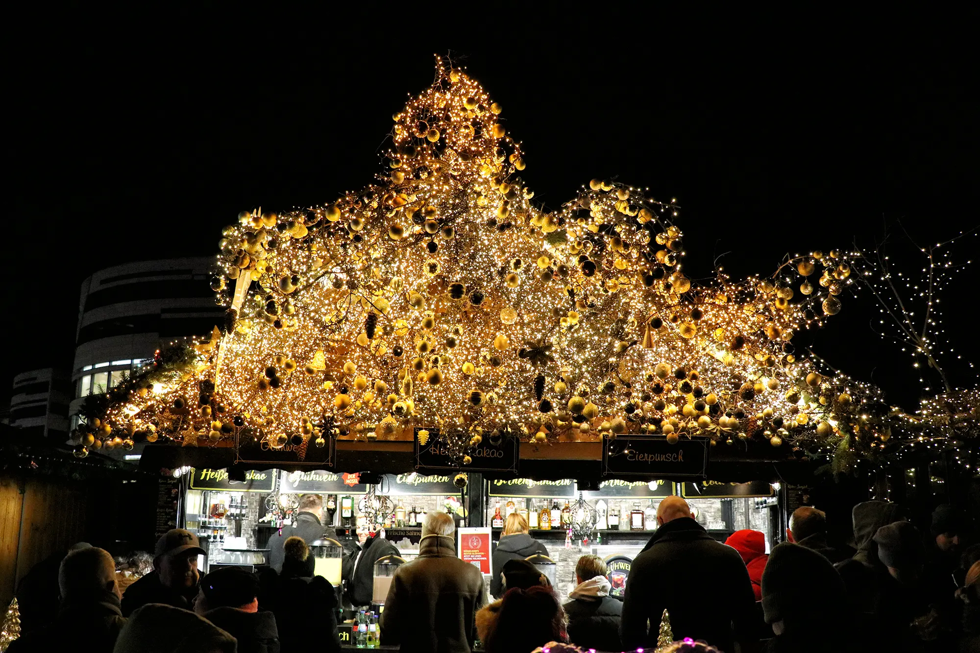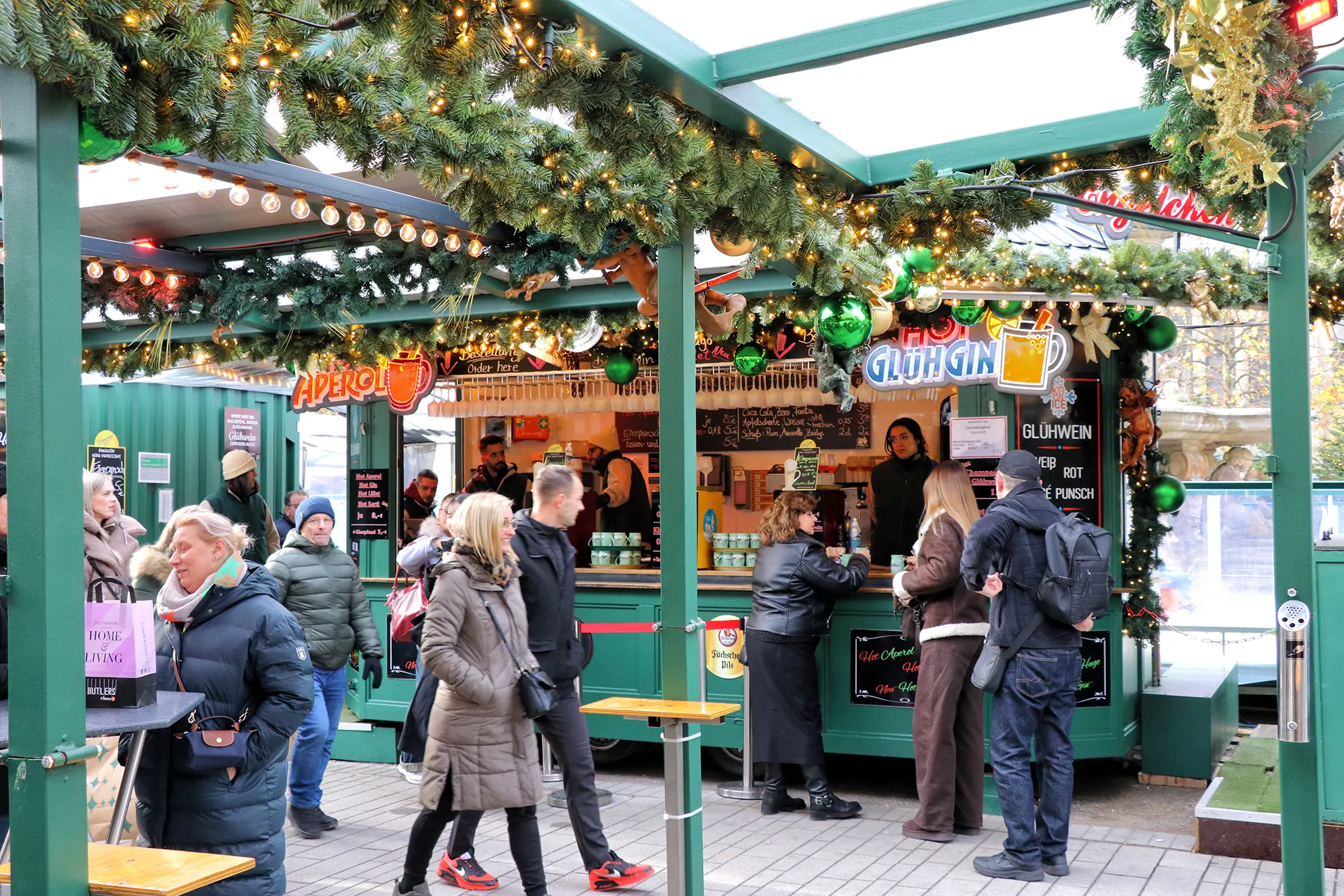 Wie zin heeft in iets anders dan Glühwein, heeft voldoende andere opties. Je kunt warme chocolademelk, punch, cocktails, Eierpunsch of een biertje bestellen. Bij het Glühtürmchen op Corneliusplatz staat een opvallende specialiteit op de kaart: de Hot Espresso Martini, een winterse variant op de klassieke cocktail. Op de Königsallee kom je zelfs kraampjes tegen waar je een glas bubbels kunt drinken, passend bij de uitstraling van de luxe winkelstraat.