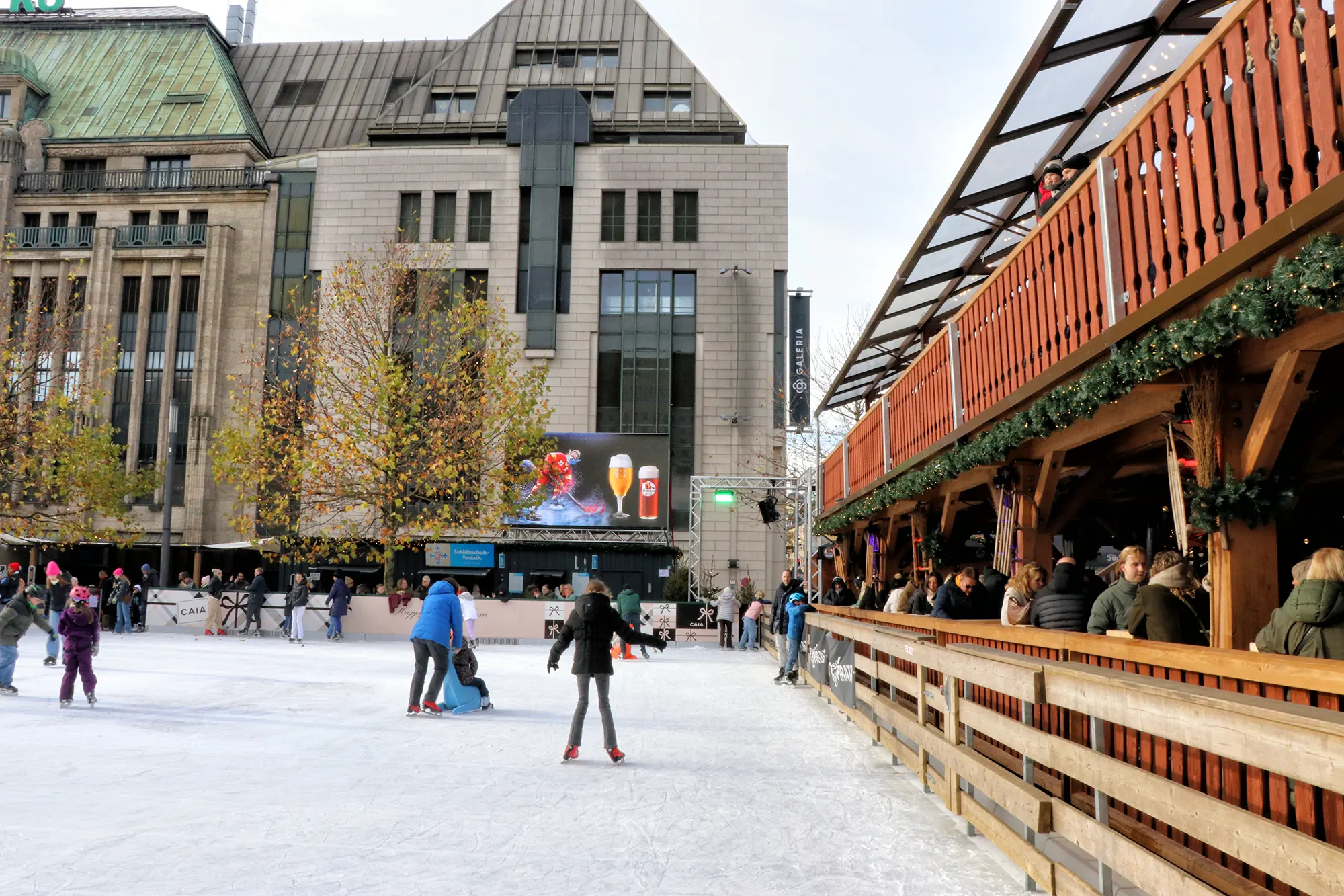 Kö on Ice draait natuurlijk om de grote ijsbaan op het Corneliusplatz. Je kunt hier schaatsen of Eisstockschießen proberen. De Alm direct naast de baan zorgt voor een gezellige sfeer en is een populaire ontmoetingsplek voor de mensen. Vooral in de avond kan het er druk worden, wanneer er tassen worden gecontroleerd en er soms een wachtrij ontstaat. Maar als je eenmaal binnen bent kun je genieten van veel sfeer, lekkere gerechten en een vers getapt Füchsen bier of een warme Glühwein.