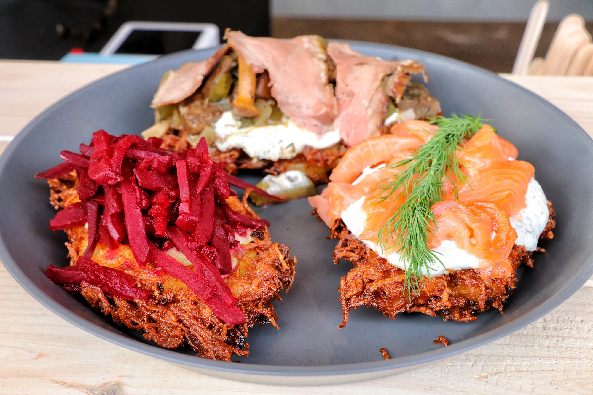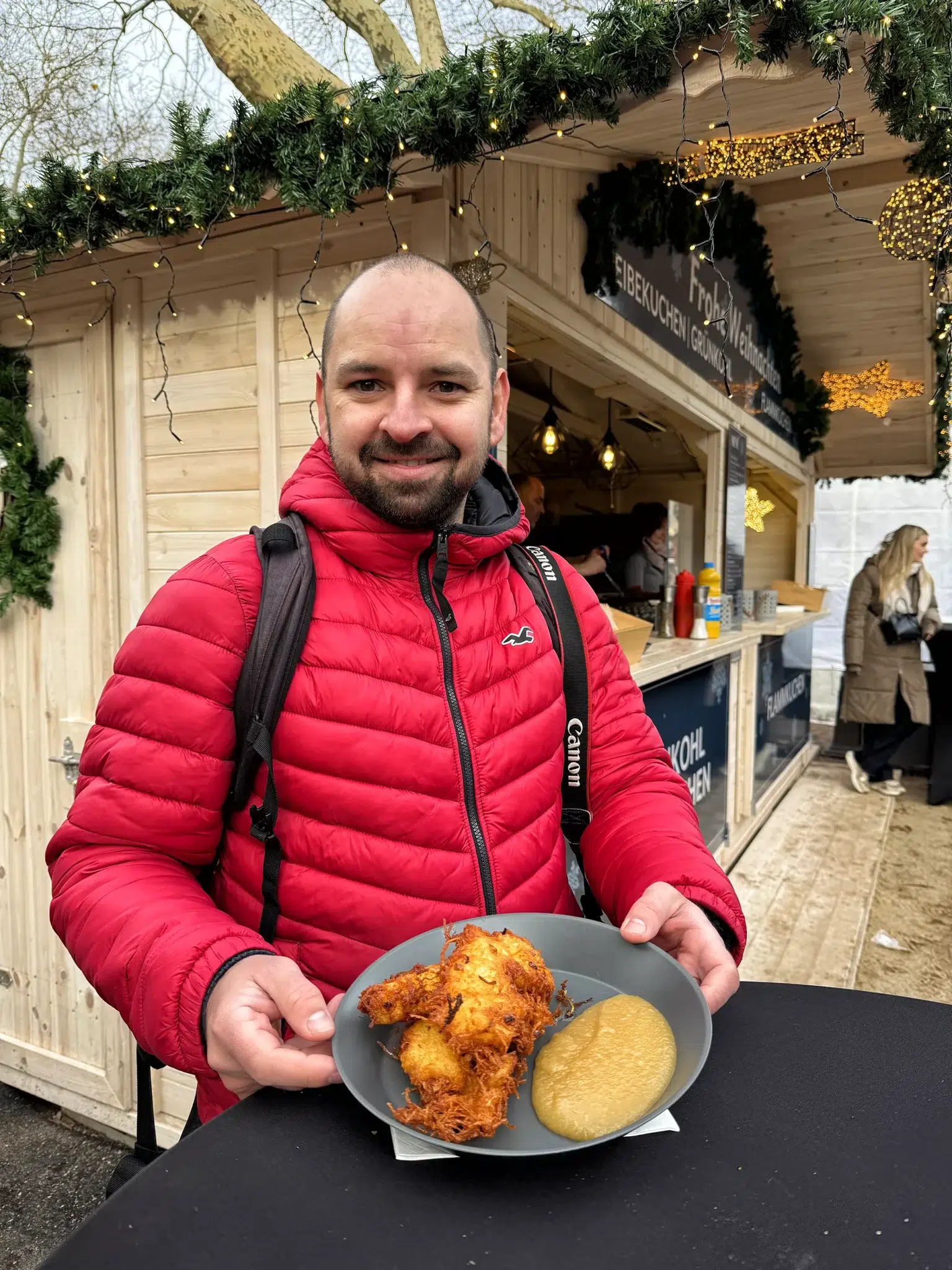 Op de Königsallee worden die klassiekers soms in een moderner jasje gestoken. Reibekuchen met zalm, rode biet of eend had ik nog nooit eerder op een kerstmarkt gezien. Leuk om eens iets anders te proberen.