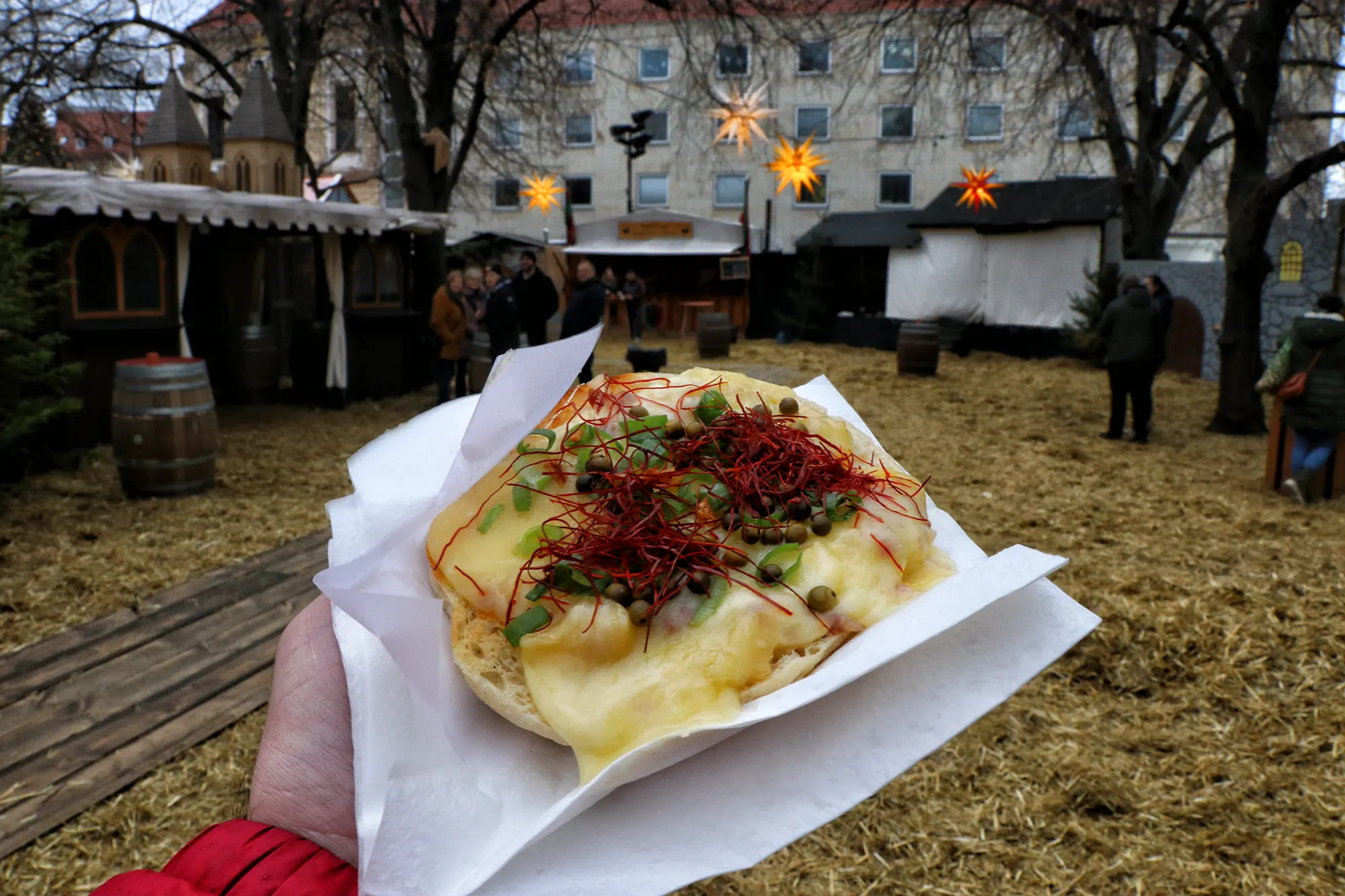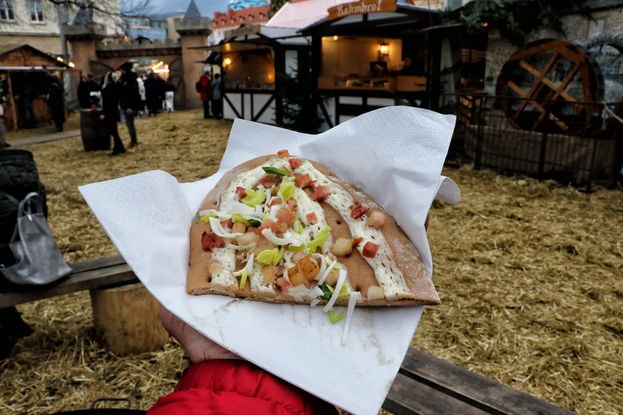 Qua eten stelt de kerstmarkt van Magdeburg niet teleur. Naast klassiekers als Bratwurst, Reibekuchen en gebakken champignons vind je er ook verrassende specialiteiten die je niet op elke kerstmarkt tegenkomt. Ik at er onder andere Mutzbraten, een Oost Duitse vleesspecialiteit van gekruid en gegrild varkensvlees. Ook het Rahmbrot, vers brood met een romige crème en kruiden, is een aanrader.