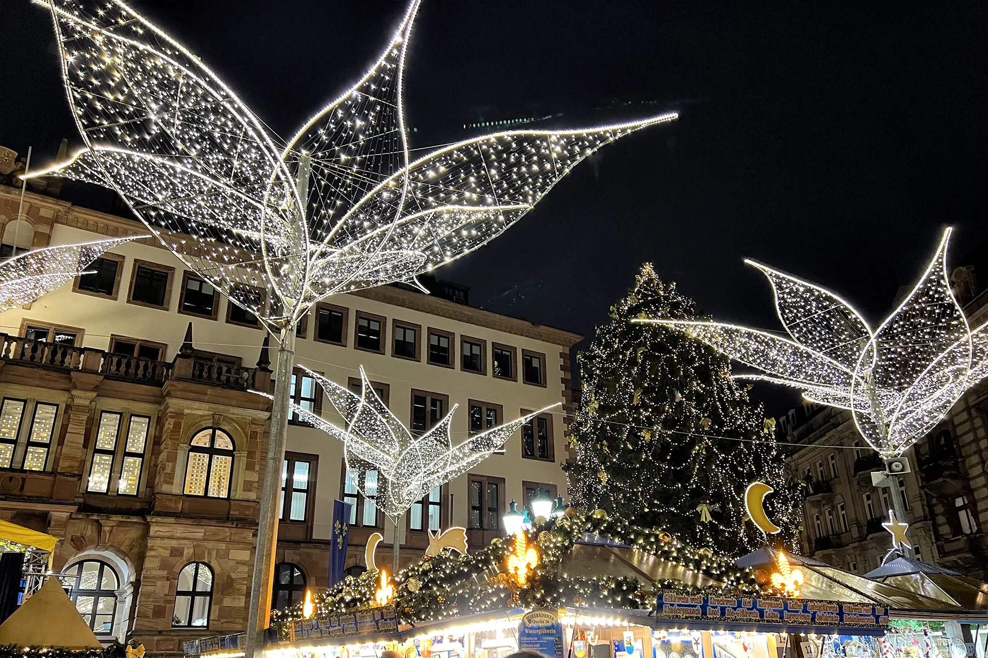 Op de Markplatz staat een grote kerstboom die is opgebouwd uit meer dan 2.000 kerststerren. In combinatie met het verlichte gebouw is dit een van de mooiste plekken om ’s avonds foto’s te maken. Pal voor het Kurhaus ligt Wiesbaden on Ice op het Bowling Green, de grootste mobiele ijsbaan van Duitsland. De ijsvloer ligt direct voor het Kurhaus, wordt omringd door tenten en horecapunten en je kunt er schaatsen en Eisstock schieten.