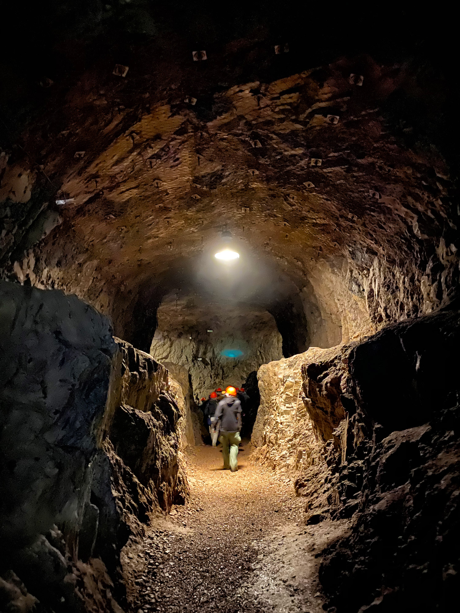 Bij aankomst bleek dat we direct konden aansluiten bij de eerstvolgende rondleiding: de ‘Historische Route’. Bij de kassa kochten we tickets en huurden we een audioguide. Vanwege coronamaatregelen kregen we ook een haarnetje en handschoenen mee. Niet veel later stonden we met een groep bij de ingang van het complex. Onze gids verwelkomde iedereen in het Pools en we kregen een helm uitgereikt. Daarna gingen we de tunnels in.