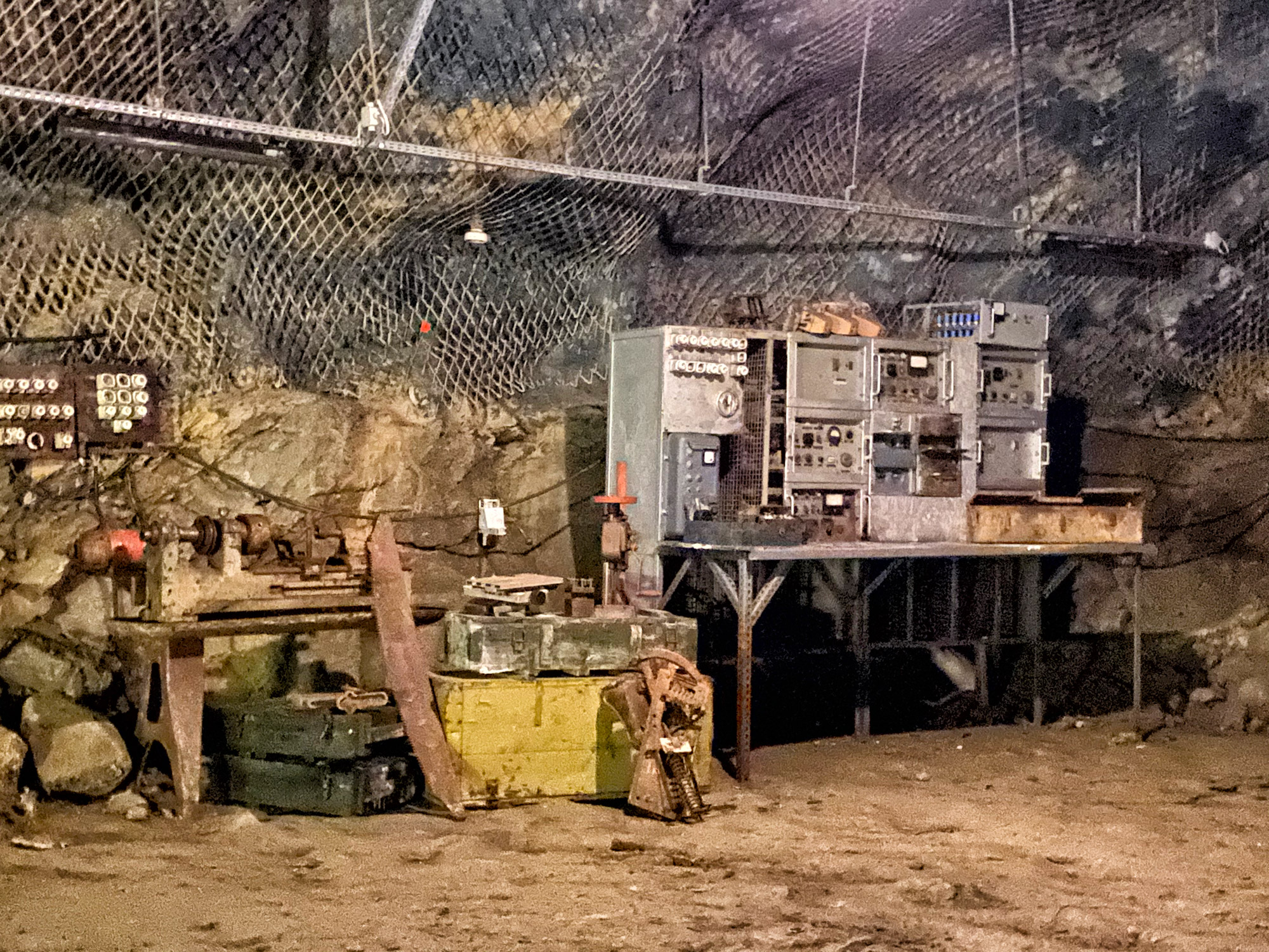 Hoe dieper we de grotten inlopen, hoe meer sporen uit de Tweede Wereldoorlog zichtbaar worden. We zien ontwerpen van de Arado 555 en oude communicatieapparatuur. Naast onderdelen en kogellagers liggen er ook verroeste bommen, granaten, geweren en munitie opgeslagen in houten kisten, nog altijd voorzien van nazisymbolen. Op een muur staat met grote letters: “Achtung! Explosionsgefahr!” Het maakt de sfeer extra beklemmend. Gezien de hoeveelheid achtergelaten materiaal is het duidelijk dat dit complex een bredere functie had dan alleen de productie van kogellagers of het ontwerpen van vliegtuigen.