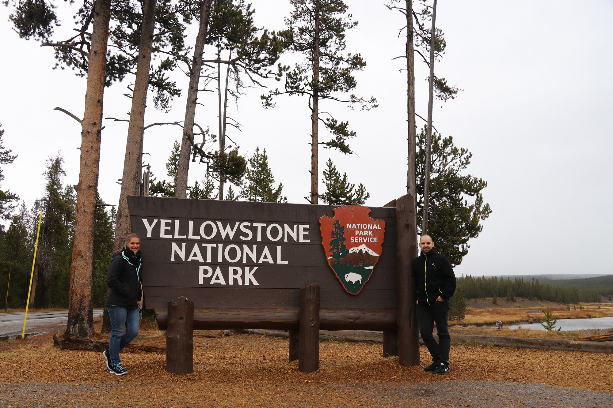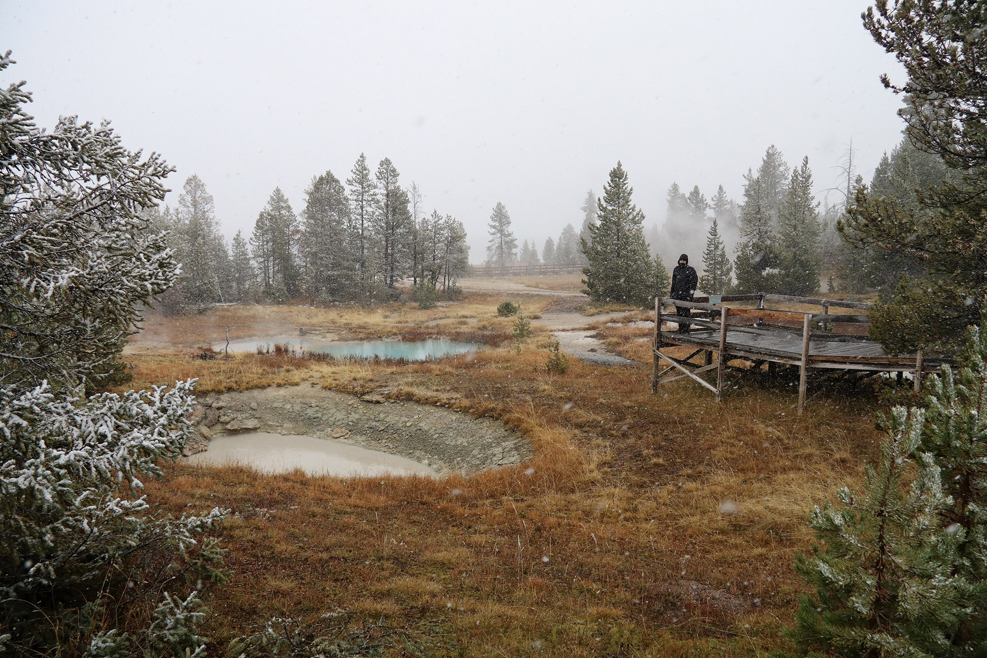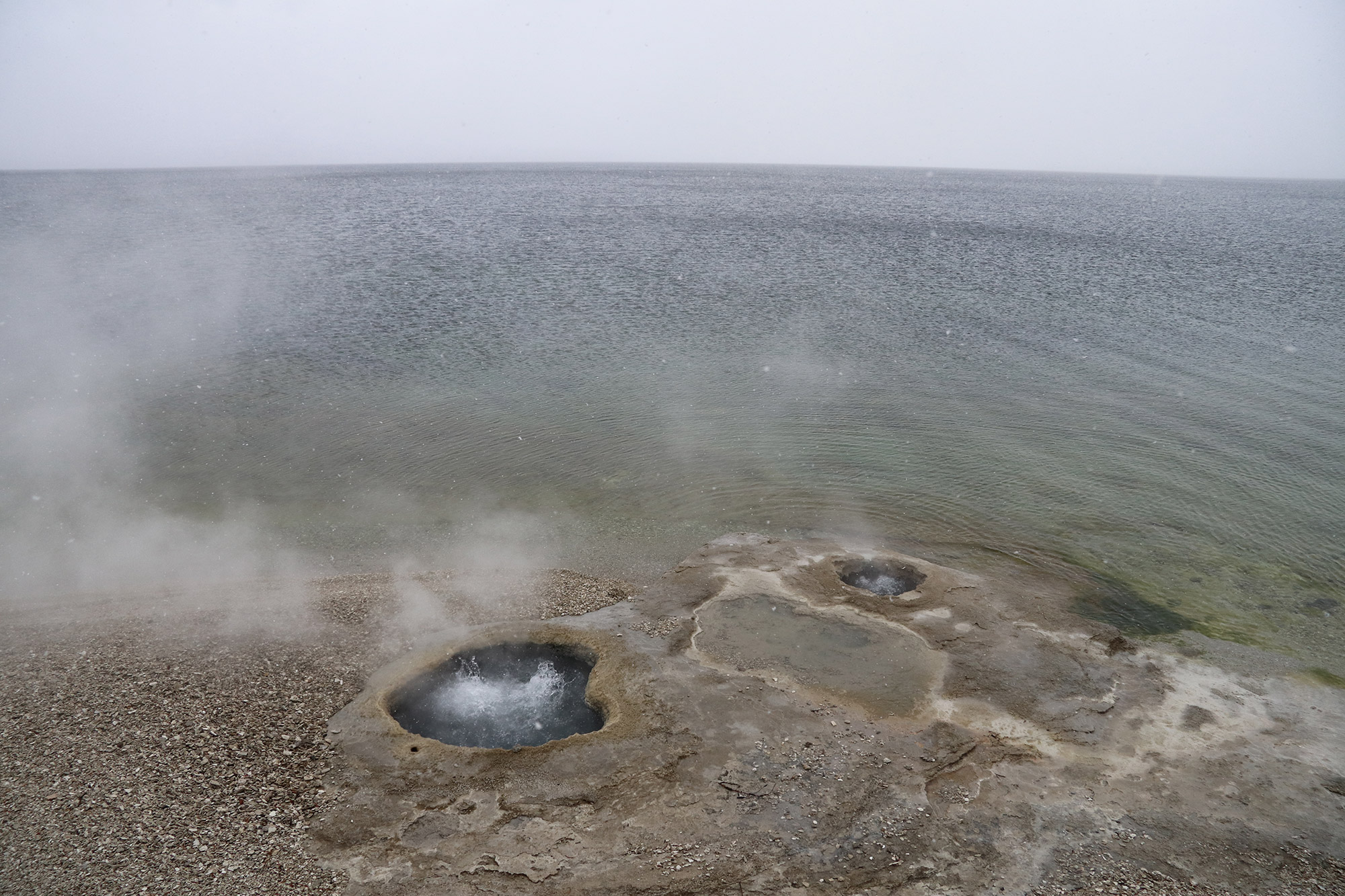 Zodra je het Grand Teton National Park verlaat, kom je alweer in het volgende: Yellowstone National Park. Hier zullen we de komende drie dagen verblijven. De eerste avond zullen we midden in het park overnachten. Omdat het seizoen afgelopen is en alle andere accommodaties inmiddels gesloten zijn, slapen we de nachten erop net buiten het park in het dorpje Gardiner. Zodra we het park inrijden maakt regen plaats voor natte sneeuw en niet veel later zelfs sneeuwvlokken. De omgeving wordt alsmaar witter en witter en de temperaturen dalen heel snel. Voordat we naar ons hotel rijden, willen we eerst nog enkele spots bezoeken. De West Thumb Geyser Basin is er één van. Hier maken we kennis met de vulkanische activiteiten van het gebied. Er zijn enkele prachtige geisers te zien met borrelend water en modder. Uiteraard kan de rotte eierenlucht van de zwavel niet ontbreken. Enkele geisers hebben bizarre formaties en prachtig heldere kleuren. Het is soms even wachten tot de enorme stoomwolken verdwenen zijn en we zicht hebben op het water. Door de kou en de sneeuw merken we al snel dat we niet warm gekleed zijn, toch maken we de wandeling helemaal af.
