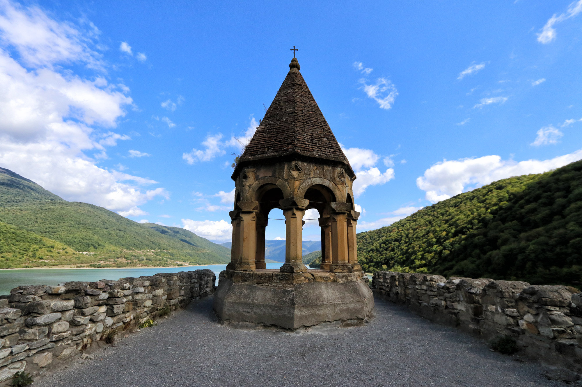 Ondanks de ergernissen en dat ik steeds waakzaam moet zijn, probeer ik ook te genieten van de omgeving. We maken korte stops bij de Zhinvali Dam en het Ananuri klooster. Hoe meer we in de bergen komen, hoe mooier het uitzicht wordt. Een enorm rond kunstwerk doemt op en wij maken hier een korte stop. Het monument is een teken voor de vriendschap tussen de Sovjet-Unie en Georgië. Erg mooi is ie niet, maar de locatie waar dit het monument staat is schitterend. Het uitzicht op de Jvari Pass is fantastisch. In de lucht zien we behoorlijk wat paragliders die hier vast en zeker genieten van de prachtige omgeving. Wat we wel merken is dat het een stuk frisser is dan de afgelopen dagen. Door de bewolking is het maar 10 graden, 15 graden minder dan eerder op de ochtend.