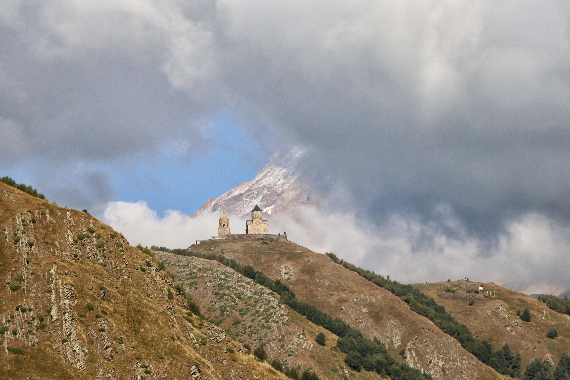 De Gergeti Trinity Church is prachtig gelegen. Hoog boven Kazbegi met op de achtergrond de machtige Mount Kazbek. Helaas is de top van de berg in de wolken gehuld.