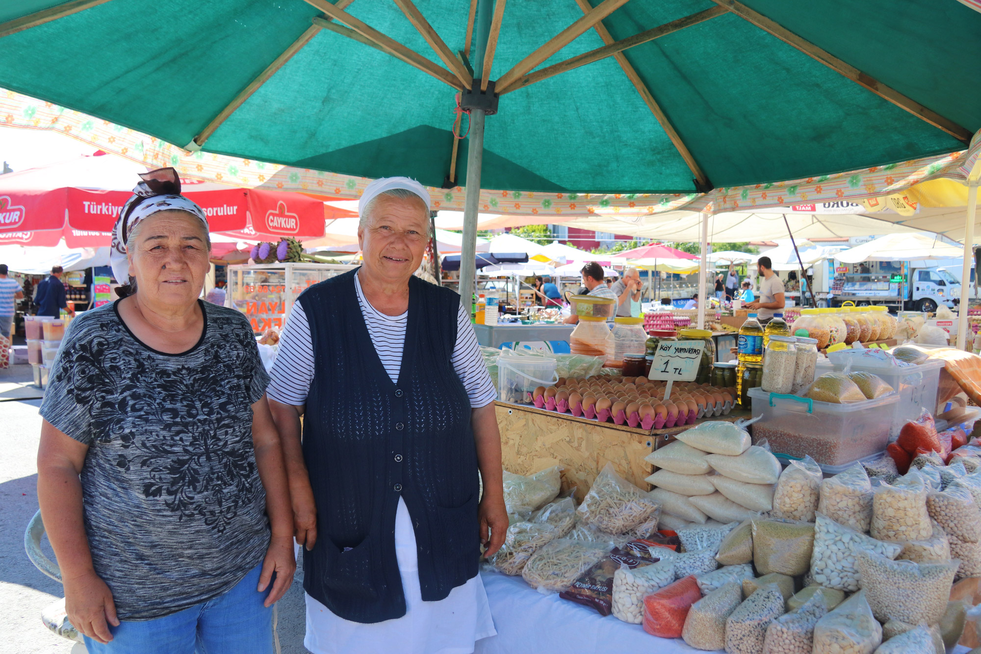 We beginnen de markt bij de etenswaren. Olijven, jam, vis, kruiden, specerijen, noten, eieren, kaas… Er is zoveel te zien. De Turken maken een praatje met ons en bieden ons enkele etenswaren aan om te proeven. Twee vrouwen zien ons foto’s maken en willen ook graag op de foto. Bij de groente en fruit zijn mannen druk bezig met het klaarzetten van hun waren. De groente en fruit wordt op elkaar gestapeld. Niet één of twee kraampjes, nee tientallen bij elkaar. Je zou haast niet weten waar je je producten zou moeten kopen.