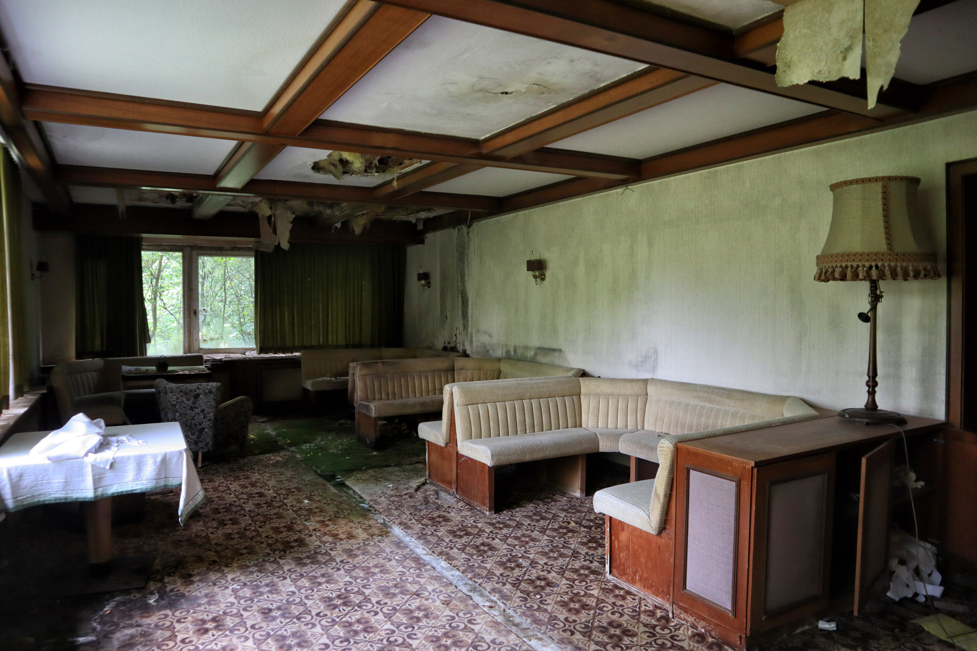 Inmiddels is het toerisme weer toegenomen getuige de hotels en vele vakantiewoningen. Gelukkig staat Hotel Teddybär redelijk beschut aan het einde van een straat. We parkeren de auto op loopafstand van het gebouw en gaan op verkenning uit. De tuin rondom het hotel is flink gewoekerd en biedt voldoende bescherming om niet op te vallen. Al snel vinden we een opening bij een kapot geslagen raam. We klimmen door het raam en staan direct in de ruimte met het zwembad. Wat direct opvalt zijn de tegels aan de muur. Hierop is een vredig landschap afgebeeld, waarschijnlijk uit de regio zelf. De ruimte ziet er verder nog vrij onaangetast uit en dit biedt hoop voor de rest van het pand. De volgende ruimte die we bezoeken heeft veel weg van een soort leesruimte of spelletjeskamer waar men vroeger in alle rust een boek kon lezen of gewoon even kon chillen. In de ruimte staan nog enkele tafels en stoelen. Ook zien we we een oude TV en komen we een menukaart tegen uit 2 mei 1998. Het heeft er dus alle schijn van dat het hotel aan het einde van de jaren ‘90 in ieder geval nog geopend was. Hoewel het interieur verouderd en een beetje viezig is geworden, ziet ook deze kamer er nog redelijk intact uit. Vandalen hebben hier in ieder geval nog niet huisgehouden.