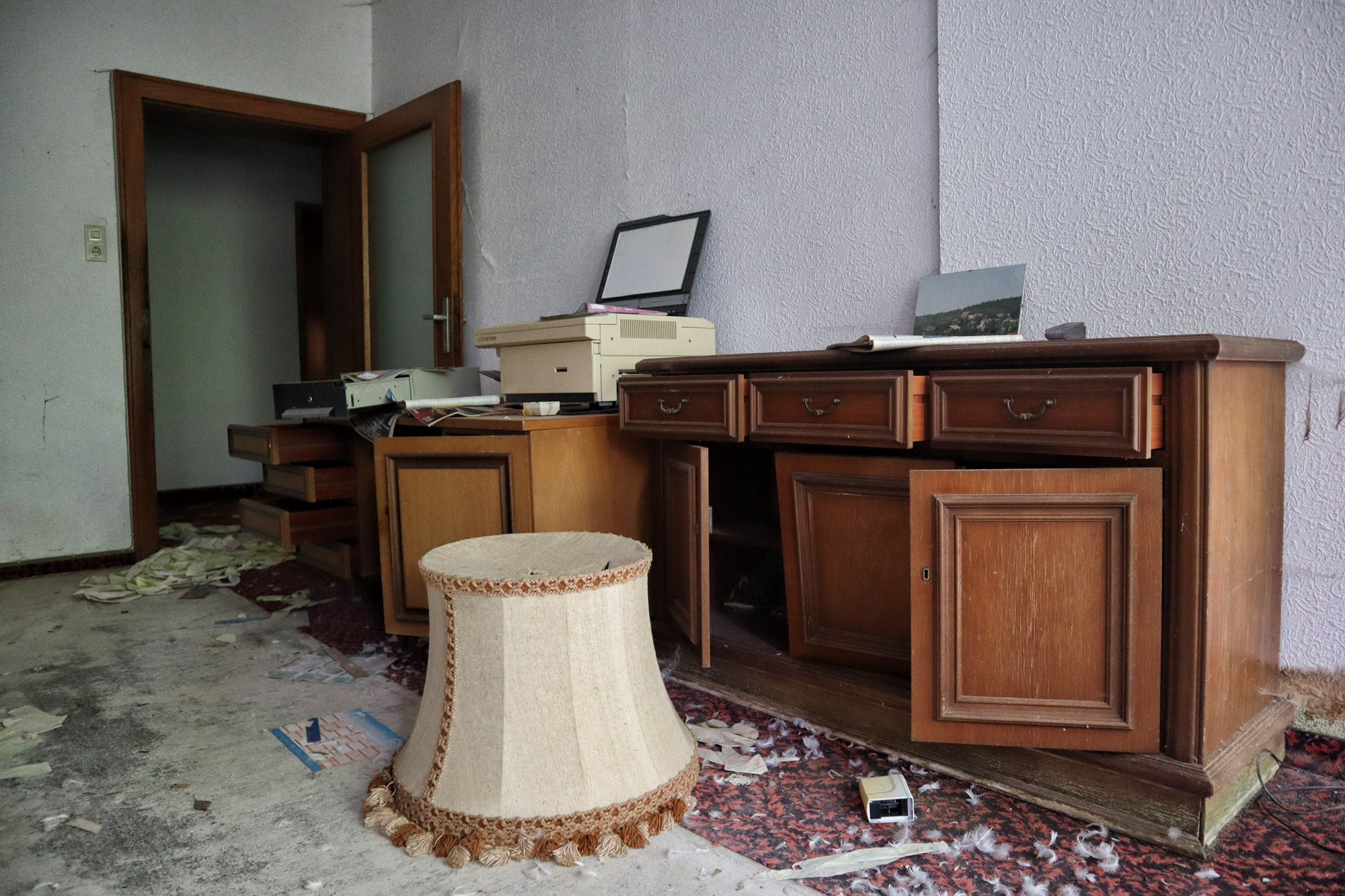 Op de eerste etage bekijken we alle kamers één voor één. De staat waarin de kamers verkeren is echt bijzonder. We hebben inmiddels al redelijk wat urbex ervaring en zijn gewend dat verlaten gebouwen snel getrashed worden door vandalen. Hier is werkelijk niets van vandalisme te zien. In sommige kamers is wat graffiti gespoten en kennelijk vonden mensen het heel erg grappig om op iedere wc hun behoefte te doen. Verder is alles helemaal intact. De kamers zijn allemaal nog voorzien van beddengoed, er staat een ouderwetse tv, een telefoon en tafels en stoelen. Op het nachtkastje staan van die heerlijke ouderwetse lampen en het behang is in veel kamers echt nog jaren ‘80 stijl. De badkamers hebben die typische gekleurde tegels die ook uit die periode stammen.