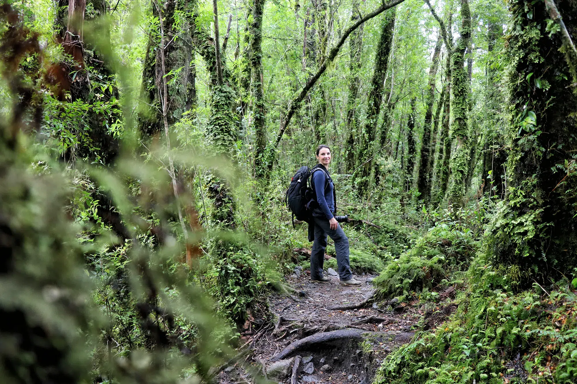Direct bij de start van de wandeling moeten we de loopbrug over de Ventisquero rivier oversteken. De rivier wordt gevoed door het smeltwater van de gletsjer en door de extreme regenval de voorgaande dagen is het een wilde rivier geworden. Hierna beginnen we aan een kleine beklimming. Op zich is het pad niet heel moeilijk, maar het pad heeft flink geleden door de regen. Het is modderig en op sommige stukken staat het volledige pad onder water. Af en toe is het dus over stenen, takken en boomstammen springen om geen natte schoenen te halen. Helaas kosten deze hindernissen tijd en inmiddels begint het opnieuw te regenen. Het leukste stuk is als we zowat door een rivier omhoog moeten beklimmen. We horen ondertussen gerommel dat verdacht veel lijkt op onweer. Met de regen en donkere wolken vrezen we dat we midden in een onweerswolk terecht zijn gekomen. Maar niets blijkt minder waar.