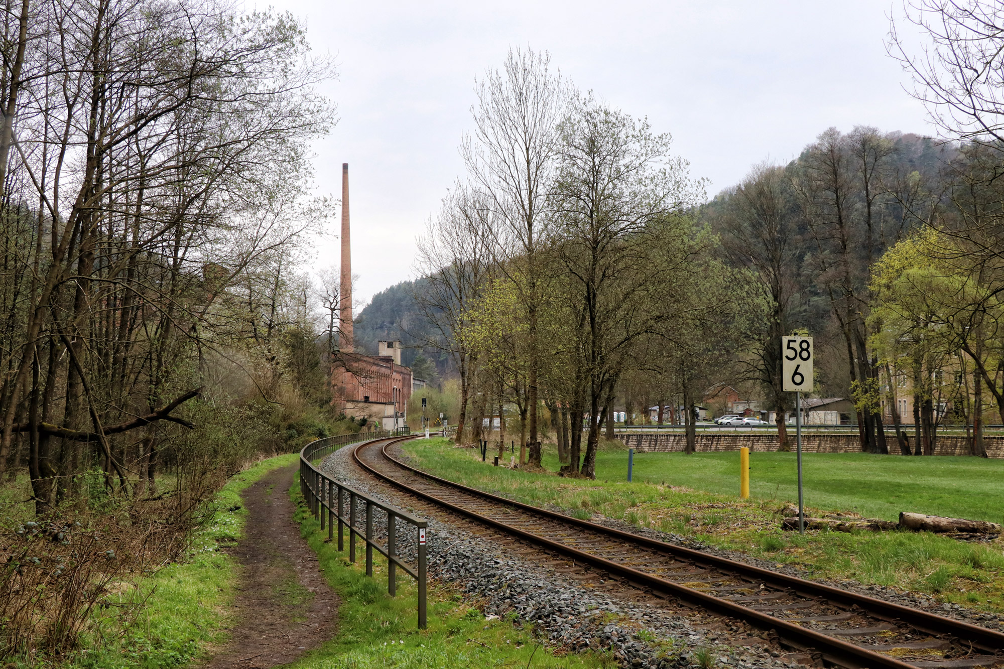Hoewel ik het complex graag van dichterbij zou willen zien, wandelen we verder. Het is namelijk gestart met miezeren en er is een flinke regenbui op komst. Via de Sebnitztal wandelen we langs het spoor naar de Schwarzbachmündung. Vanaf hier is het nog een kleine kilometer naar ons eindpunt. De miezerregen heeft inmiddels plaatsgemaakt voor een flinke hoosbui en we zijn er ook achter gekomen dat we nog een tijdje op de bus moeten wachten. Gelukkig kunnen we in Altendorf even schuilen bij Gasthaus Heiterer Blick. We warmen onszelf op met een kopje koffie en een thee en wachten hier tot de bus arriveert.