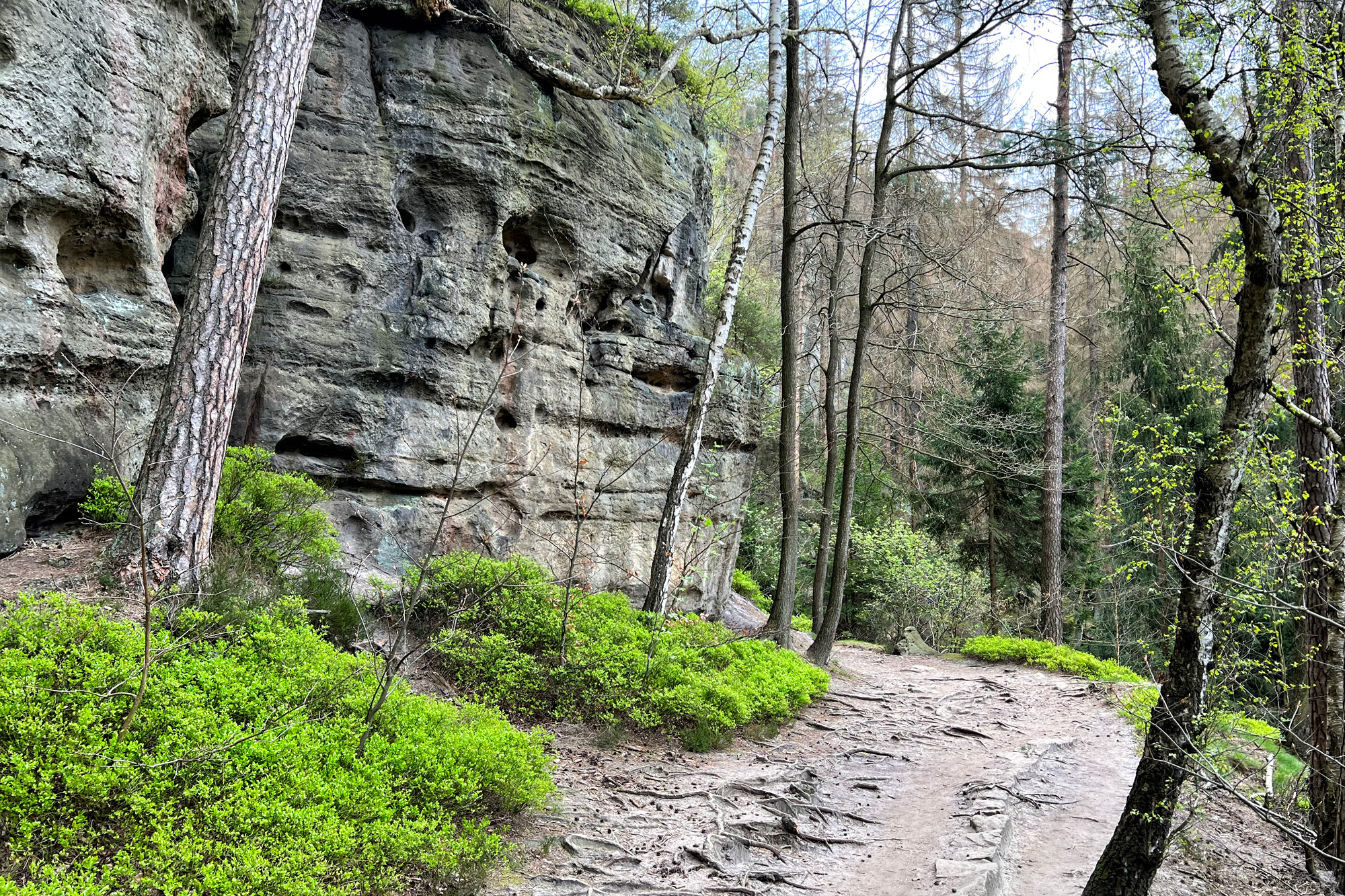 Vanuit Waitzorf wandelen we over de Waitzdorfer Rundweg en de Mühlweg verder door de rustgevende natuur. Opvallend zijn de felgroene struiken die hier groeien en het landschap kleur geven. Het ziet er echt prachtig uit. We stoppen nog even bij een uitzichtpunt vanaf de Öchelwände op het Polenztal en wandelen verder door het eveneens mooie Kohlichtgraben. Over kleine bruggetjes en rotsen wandelen we langs de oevers van dit kleine riviertje.