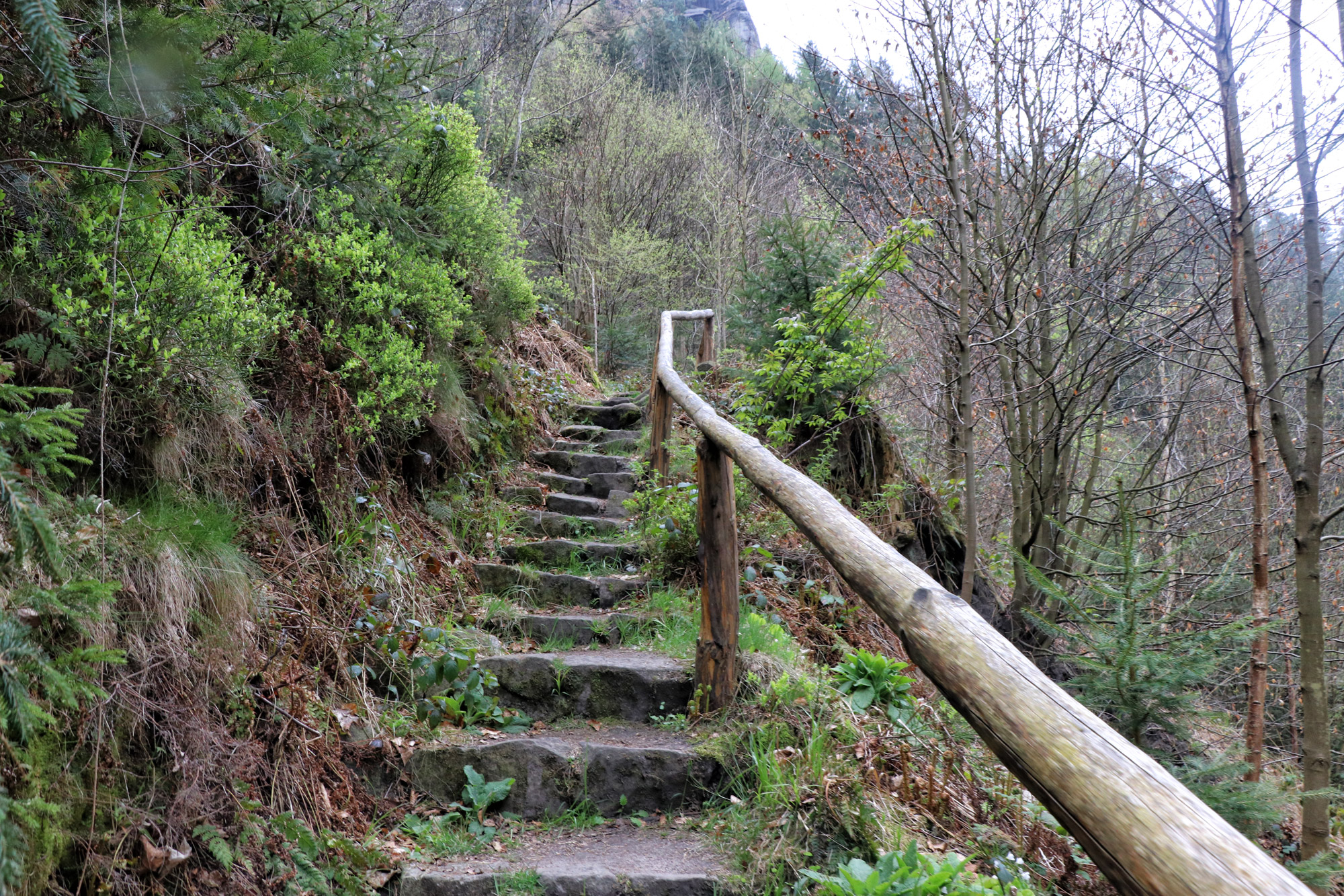 Onze benen worden even getest. Bij de Brandstufen moeten we 800 traptreden naar beneden om af te dalen naar de Tiefer Grund. In enkele minuten dalen we zo’n 300 meter af via houten trappen en metalen ladders. Eenmaal beneden wandelen we een klein stuk over de autoweg tot we rechtsaf weer omhoog moeten wandelen. Ditmaal moeten we 800 traptreden omhoog klimmen richting het dorp Waitzdorf. Als we eenmaal boven zijn nemen we even een kleine pauze om weer op adem te komen.