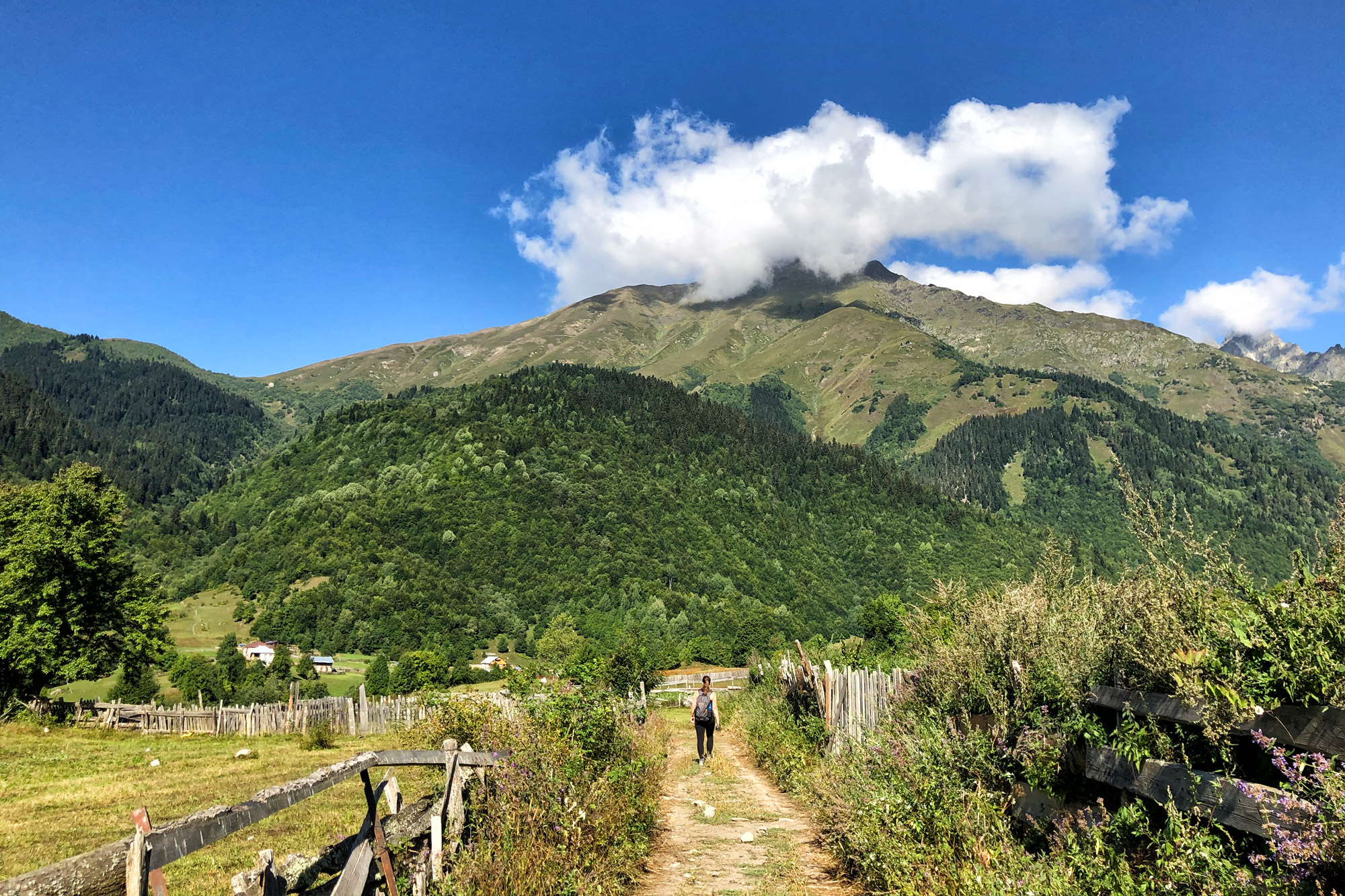 Startpunt van deze wandeling is het bergdorpje Mazeri. Dit dorpje ligt op zo’n 20 kilometer van Mestia af en is het beste te bereiken met je eigen huurauto. Er gaan stoppen hier geen marshutka busjes. Mocht je geen eigen vervoer hebben, kun je het beste liften of een taxi nemen. Langs de weg staan al bordjes aangeven richting de Ushba Glacier. Volg hiervoor de rood/witte driehoeken. Mazeri is zo’n typisch bergdorpje waar de tijd stil lijkt te staan. We passeren in het dorp enkele oude auto’s en komen een boer tegen die met zijn runderen en een berg gras door de smalle zandwegen wandelt. Het gebied was ooit eigendom van de prinsen Dadeshkeliane. Ooit stond hier een toren van 10 verdiepingen, maar de de eigenaren lieten het in 1921 opblazen. Restanten van de toren kun je in de buurt van het dorpje nog vinden.