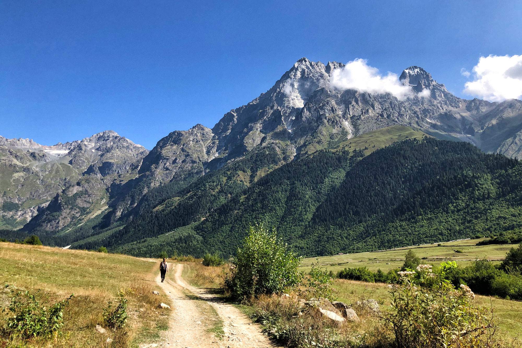 Al vanaf het moment dat we zijn begonnen met wandelen hebben we een uitstekend zicht op de Oesjba (Ushba). Dit is de meest iconische berg van het Kaukasus Gebergte vanwege de dubbele spitsvormige top. Deze berg wordt ook wel de Matterhorn van de Kaukasus genoemd. De hoogste top ligt op 4710 meter boven zeeniveau. Hiermee behoort de Oesjba niet eens in de top 10 van hoogste bergen in de regio. Vanwege het steile profiel en de onvoorspelbare weersomstandigheden wordt de Oesjba door bergbeklimmers beschouwd als de moeilijkste te beklimmen berg van de Kaukasus. In de recente geschiedenis zijn er reeds enkele mensen vermist en overleden. Wij genieten daarom maar van een afstandje van deze imposante berg met besneeuwde toppen. Met het stralende weer, is deze berg een prachtig decor van onze wandeling.