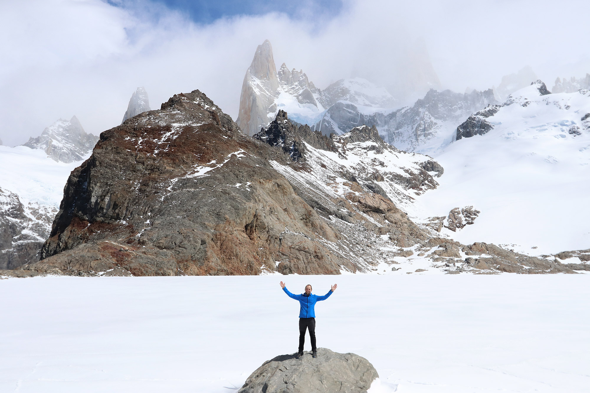 Onder de majestueuze Mount Fitz Roy ligt het bergmeer Laguna de los Tres. Normaal gesproken zouden we hier een groen meer moeten zien. Door de kou is het meer echter bevroren en ligt er een enorm pak sneeuw op. Hoewel het verleidelijk is, wandelen we maar niet over het meer. We hebben immers geen idee hoe dik het ijs is.